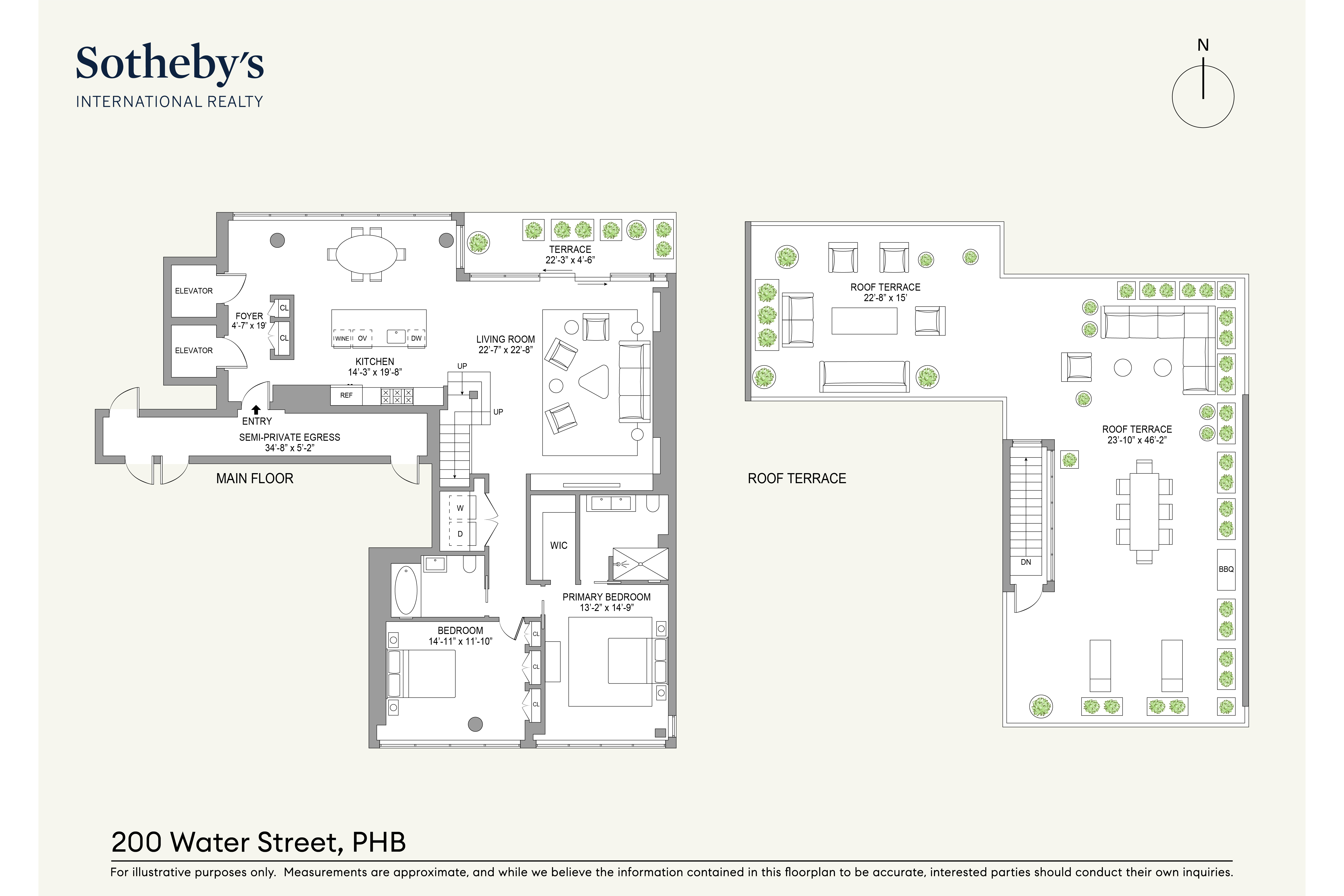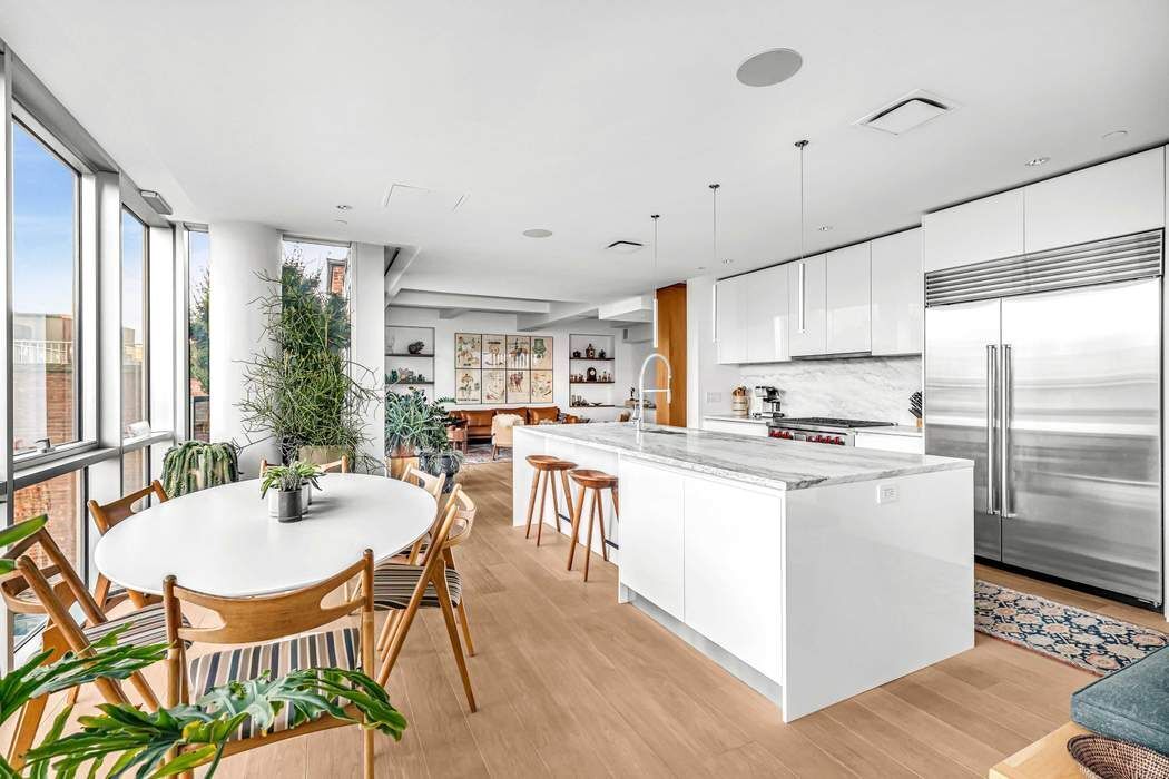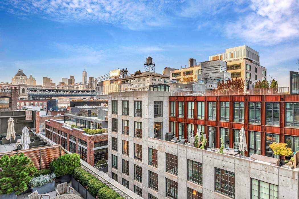 • Welcome to Penthouse B at 200 Water Street, a special home located in Brooklyn's historic DUMBO neighborhood! A keyed elevator opens directly into the gracious entry foyer of this exceptional duplex penthouse. Floor-to-ceiling glass curtain walls with northern and southern exposures flood the home with natural light. The meticulous detailing throughout the interior and exterior of this home makes it truly remarkable. This stunning penthouse offers two bedrooms, two full baths, approx. 1,871 +/- sq. ft. of interior space, and approx. 1,695 +/- sq. ft. of private exterior space across multiple levels. The well-designed living room features custom-built white oak shelving, recessed cove lighting, and marble-topped storage cabinetry. The living room seamlessly opens to the first private garden terrace, offering impressive views and serving as a perfect continuation of the space. The full scale of this open space is prefect for entertaining or everyday living. Enjoy your favorite movies and music with an integrated sound system installed throughout the apartment. Additionally, there is a full-length, floor-to-ceiling retractable drapery for added ambiance and privacy. The open chef's kitchen boasts a large marble topped center island with counter seating, abundant storage options, custom cabinetry from Pedini and top-of-the-line appliances. These include a Sub-Zero refrigerator and wine fridge, a Wolf six-burner cooktop and oven, vented hood, Bosch dishwasher, and an integrated Sharp microwave. Countertops and backsplash made of Montclair Danby marble are complimented by a polished chrome Hansgrohe faucet. As you enter the generously sized primary suite, you’ll immediately appreciate the thoughtfully designed layout. This suite features a large custom fitted walk-in closet, Poulsen sconces on both sides of the bed, and a luxurious en suite bath. The en suite bath is highlighted by a glass shower enclosure with polished chrome Hansgrohe fixtures, hexagonal Blanco Carrara mosaic wall and floor tiles, a custom medicine cabinet with LED lighting, and a Duravit toilet. Also, on this level is the second bedroom, highlighted by custom closets, along with a conveniently located full bath, designed with the same high-end finishes as the primary bath. The architectural staircase leading up to the second level features a custom single-piece wood banister with recessed lighting and a Poulsen wall light. While upstairs, you will be struck by the incredible private rooftop terrace that wraps around two sides of the home, featuring a mature evergreen and hydrangea garden, a freestanding American Made grill, multiple unique seating areas, and breathtaking views that span across the Manhattan skyline. The gardens on both levels feature timed irrigation and lighting throughout. The sheer size and layout of the rooftop terrace can certainly cater to anyone’s needs whether it’s hosting a large gathering, an intimate dinner with a view, lounging on a sunny day, or enjoying beautiful sunsets. Rounding out this impeccable home is Lutron lighting, recessed lighting, central A/C, and a laundry area with convenient custom built-in storage along with a Samsung washer/dryer. Once a Brillo factory, 200 Water Street is the true definition of a daylight concrete factory and what DUMBO living is meant to be. 200 Water Street amenities include a full-time doorman, a beautifully landscaped sunken garden, access to a parking garage, a well-appointed gym, and bicycle storage. The curated lobby features 14-foot ceilings and teak wood accents. Enjoy close proximity to the stunning Brooklyn Bridge Park waterfront, cobble stone streets, the historic Empire Stores, exceptional dining and nightlife, a vibrant arts scene, and the unique appeal of one of New York City’s most exciting and beautiful neighborhoods. Just blocks away from the F/A/C trains and Water Ferry. Just one stop into Manhattan.
