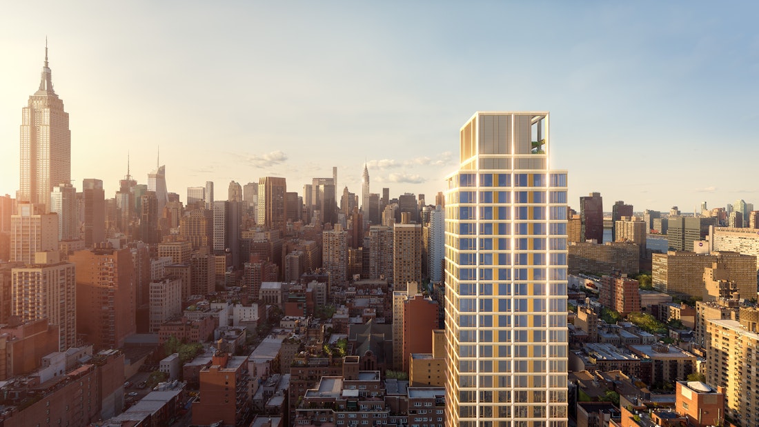 Designed by SLCE architects, the facade radiates a refined palette of oyster white and warm bronze detailing, a modern compliment to the historically rich neighborhoods that surround it. At 36 stories, the tower punctuates the city skyline and stands tall overlooking Manhattan's East Side. The architecture celebrates New Age Modernism, a design approach that emphasizes a contemporary aesthetic with clean lines, bronze embellishments, and sculpted chevron details. Oversized windows put the city on full display, and special attention was put into creating residences that maximize natural light wherever possible.