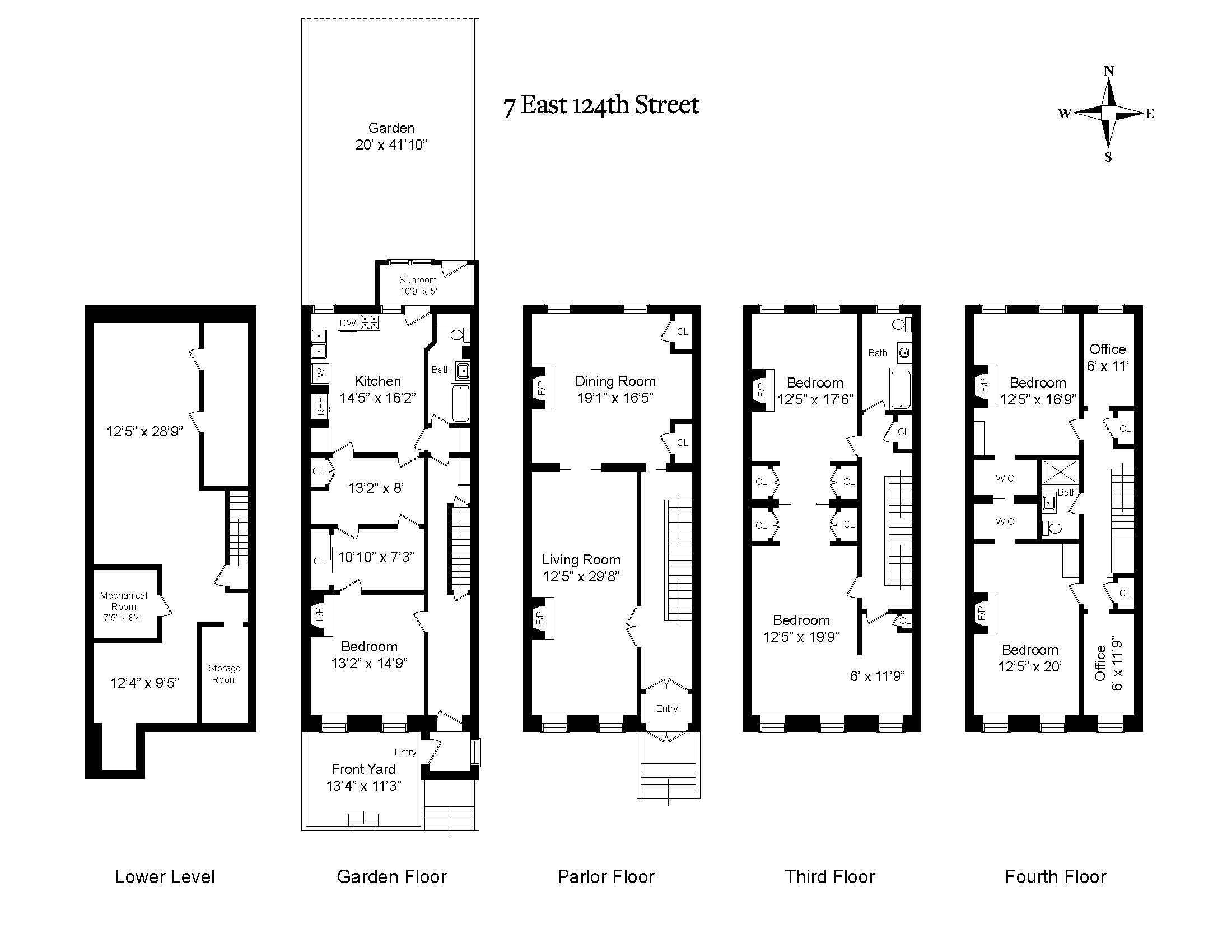 • Just Issued April 2025 Certificate of No Harassment (CONH) makes this park-front, 20-foot 1905 townhouse ready for a 21st century renewal. South sunlight fills every window in the Italianate style facade, open to the 20-acre Mount Morris Park directly across the street. With its restored facade, responsibly maintained roof, and interior full of original detail, 7 East 124th Street is a unique combination of well-preserved history and untapped development potential directly off of Fifth Avenue. The Parlor floor is perfect for entertaining with 11'4" ceiling heights and grandly proportioned living and formal dining rooms. Original details abound- from the fine plasterwork, wood shutters and intricately carved window surrounds, marble mantlepieces, and magnificent mirrors. The Parlor includes three notable architectural mirrors- two massive over-mirrors, and the first of the houses' three original "pier mirrors"-- designed inset between the front room's south-facing windows, to increase the play of bright sunlight through the home. The Garden floor features a front-facing bedroom, two interior rooms, full bathroom, and large eat-in-kitchen. A charming sunroom opens to exceptionally deep garden, running nearly 42' to the rear of the property. Third and Fourth Floors retain their classic layout of front and rear bedrooms, each with original mantlepieces and connecting WICs. Adjacent to both Fourth Floor bedrooms are windowed rooms perfect for use as either home offices, nurseries, or luxurious dressing rooms. The newly issued CONH allows the new owner to begin the renovation process without delay. 7 East 124th Street currently carries a multiple dwelling building class designation; with over 6,000 square feet of total potential usable floor area, we recommend that any interested purchases carry out a zoning review to assess expansion or other development potential. The property is being sold in as-is estate condition, and can close vacant. The Parlor, Third, and Fourth floors are currently unused, and require renovation. Bring your architect to create a magical, sunlit residence in the heart of historic Harlem.