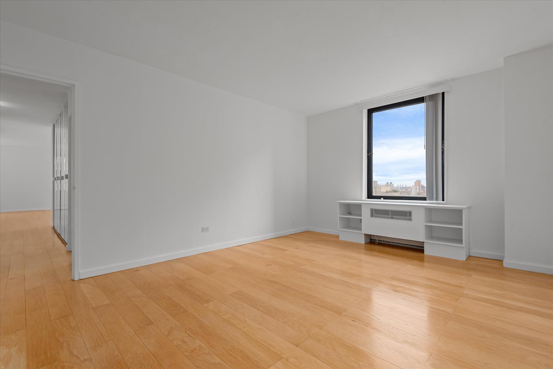 The largest two-bedroom, two-bath apartment on the highest floor of the Ruppert Yorkville complex, this tranquil corner home offers the most desirable convertible three layout. Oversized windows fill the space with natural light and showcase panoramic views of the George Washington Bridge. The welcoming foyer features a custom mirrored wall, leading into an expansive living area with elegant hardwood floors throughout, a modern kitchen with granite countertops, and abundant closet space. The primary suite comfortably accommodates a king-size bed and a study area, and includes an extra-large walk-in closet and an en-suite bath.