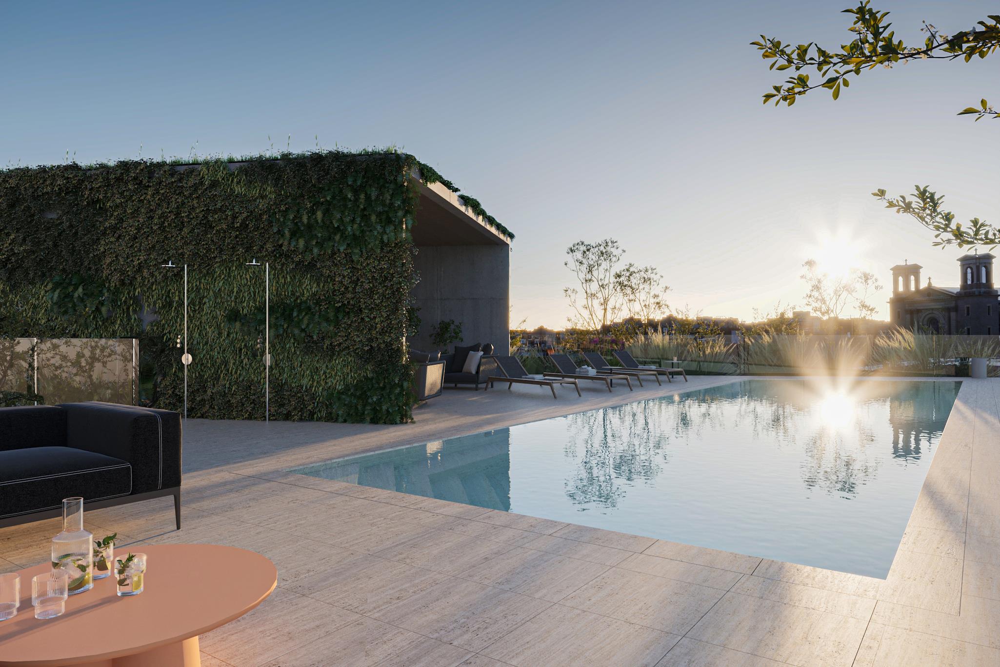 The building's amenities include a bright fitness center, game room, golf simulator, coworking lounge, conference rooms, rooftop sun deck, and a private outdoor pool located on the fifth floor. The building also offers bike storage, and private storage cages for rent– with a door person present seven days a week from 11AM to 7PM.