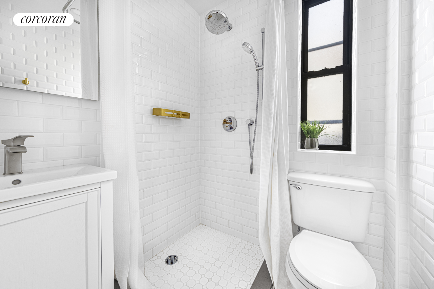 The bedroom is generous with light, and the bathroom offers a fresh modern feel with its shining white tiles and new appliances such as the Hans Grohe Rainfall shower and separate handheld shower. With all-new plumbing and upgraded electric and custom LED lighting installed throughout, this apartment is an easy, move-in-ready space built to last for decades.