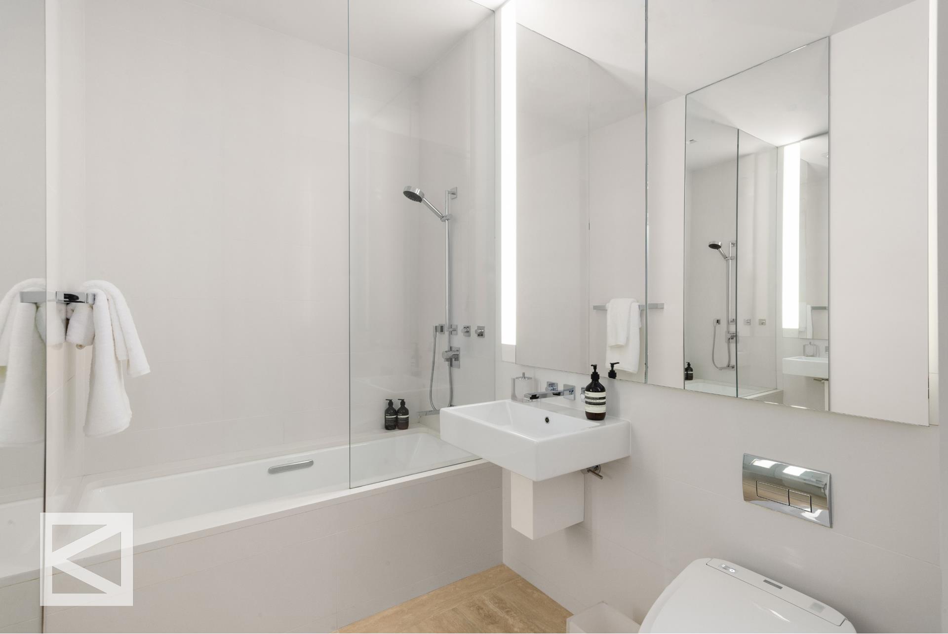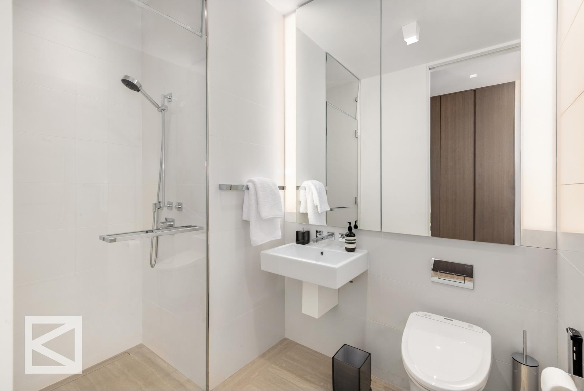 The White Oak herringbone and plank oak flooring bathes all four bedrooms in sunlight, highlighting the unparalleled design. The primary bedroom suite, with triple exposures to the south, west, and east, captures the essence of the city below. It features an expansive 25'-11" x 16" bedroom with seating area, three generous walk-in closets, and an en-suite bathroom. This five-piece primary bathroom boasts radiant heat, Luna Black granite floors, a custom Corian dual vanity with integrated lighting, a freestanding tub with city and water views, and an oversized 6x4 feet glass-enclosed steam shower with Thermasol Pro-Series steam generator, heated mirror, and floor-to-ceiling translucent glass doors.