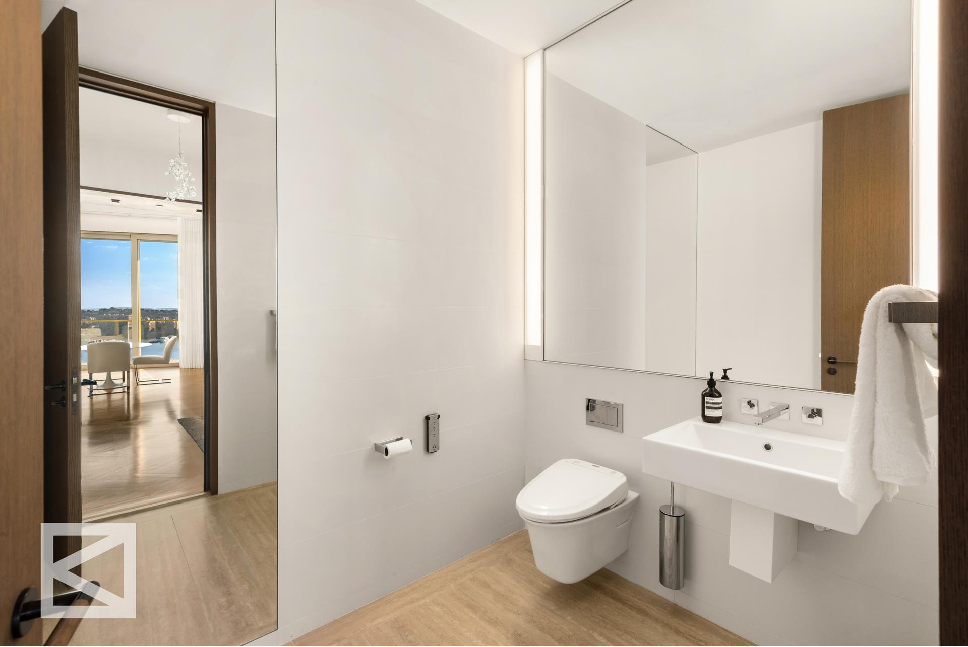 All three additional large bedrooms offer en-suite bathrooms with Travertino stone tile floors, custom-designed cabinets, and Dornbracht fixtures. They also enjoy dramatic views, high ceilings, and ample closet space. The residence is equipped with a laundry room featuring a Maytag washer and dryer.