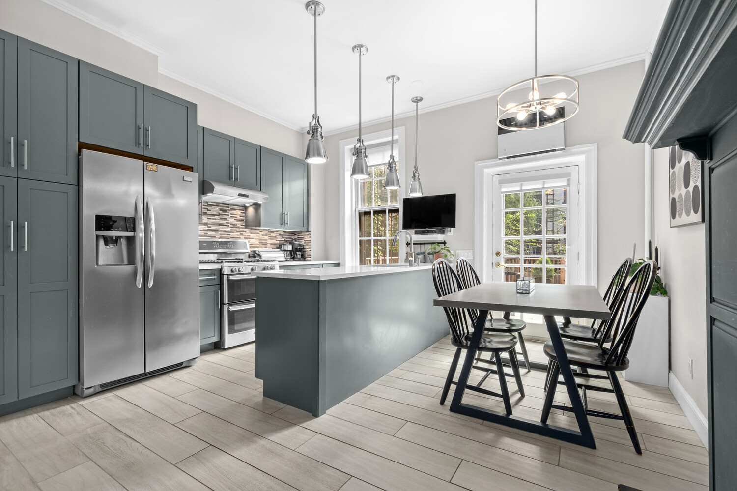 The parlor level features soaring ceilings, pristine pinewood floors, and stunning original glass-inset pocket doors. A renovated eat-in kitchen with Caesarstone counters and stainless-steel appliances opens to a large deck and lush, low-maintenance backyard, ideal for entertaining or quiet relaxation.