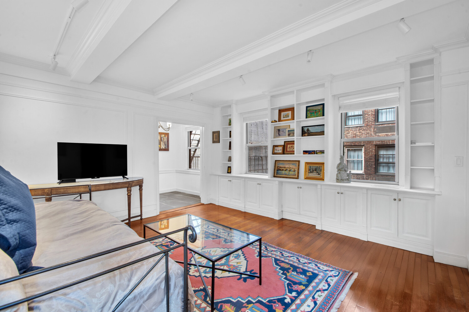 Three large windows across the living/sleeping and dining area provide natural light, with newly installed wood blinds for privacy. The home is newly painted with beautiful pre-war details including: beamed ceilings, crown molding, built in bookcases and cabinets with tons of storage space. An oversized custom-built 9'5" long three-sided walk-in closet converted from a separate sleeping alcove adds even more storage capacity.