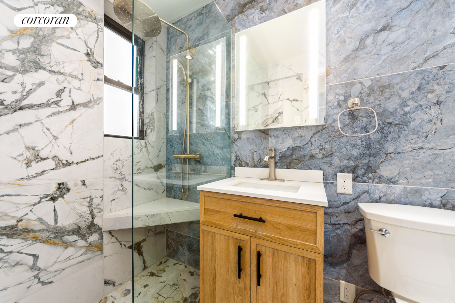 The living spaces are unified by brand-new herringbone-engineered hardwood floors, adding warmth and sophistication. The spa-inspired bathroom features elegant marble tile and a walk-in glass-enclosed shower, offering a serene, upscale feel.