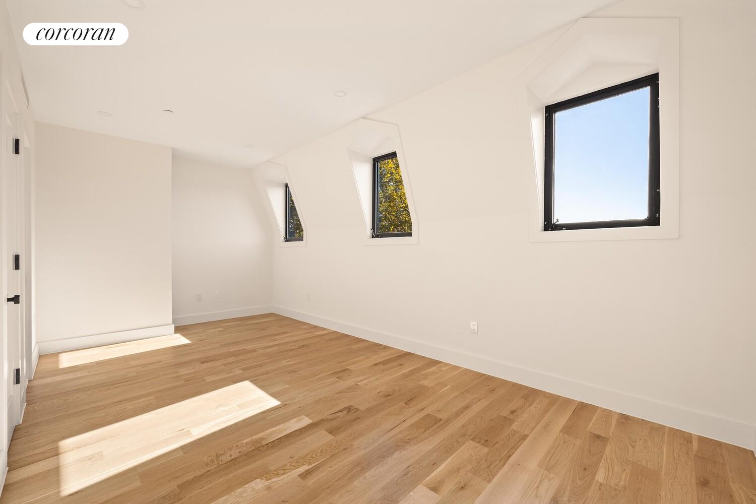 The second floor is dedicated entirely to a spacious and multi-functional primary suite. The oversized bedroom features seven floor-to-ceiling windows across three exposures, flooding the space with natural light. A separate office or bonus room/nursery adds versatility, while the showstopping walk-in closet offers extensive custom storage with integrated lighting and a storage island. The spa-like windowed primary bathroom is a serene retreat, featuring a freestanding soaking tub, creamy Zellige tile, an extra-large glass shower, elegant brushed brass Kohler thermostatic fixtures, and a fluted wood double vanity topped with marble. The extra bonus on this floor is a windowed laundry room with full sized LG side-by-side washer and (vented) dryer, a deep sink, and abundant storage. The third and fourth floors offer four generously sized bedrooms-two per level-each with its own ensuite bathroom, custom vanity, and fully built-out custom closet. All bedrooms are notably wide, enhancing the home's sense of space and flexibility. A 2nd laundry closet is conveniently located on the top floor landing.