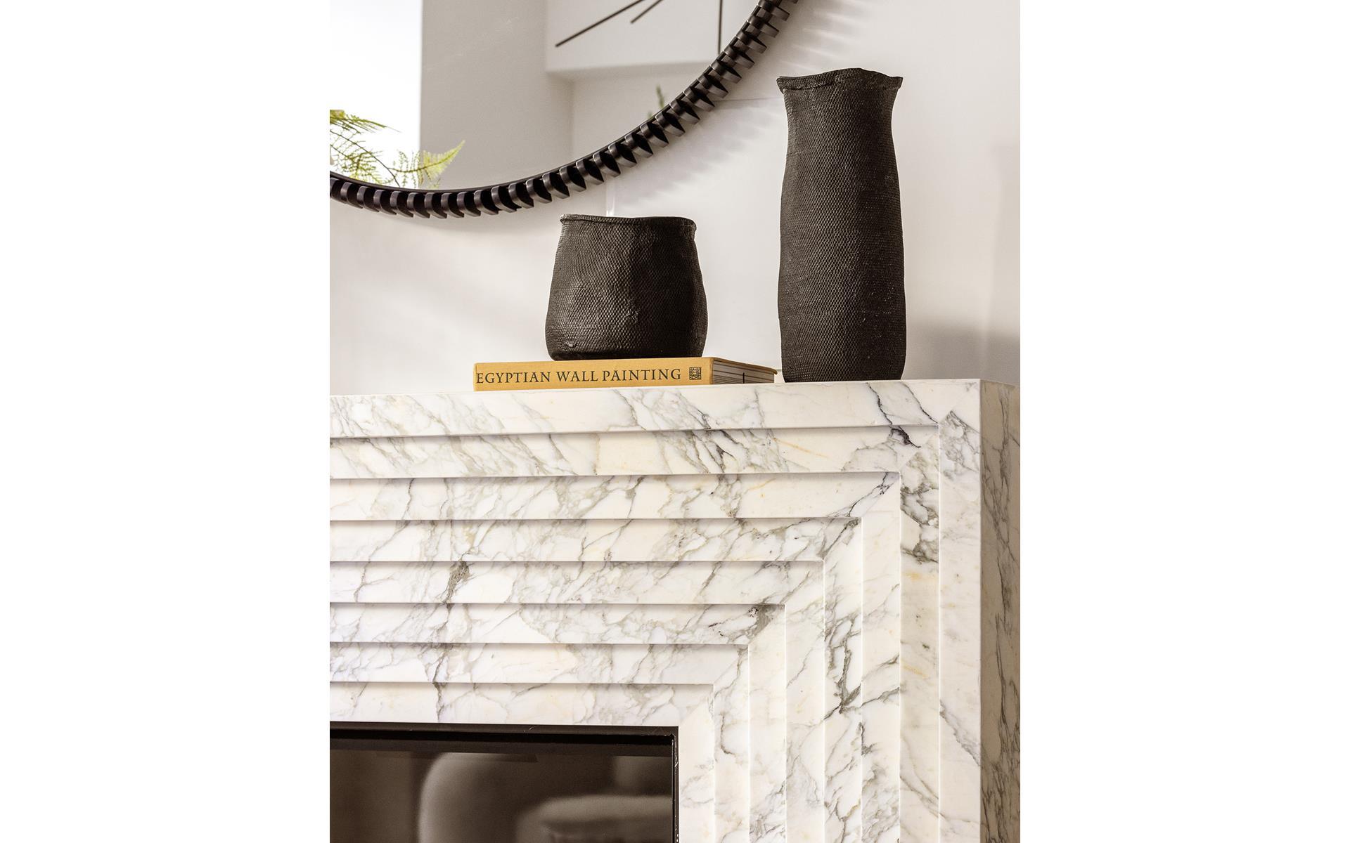 Upon entering the main level greets you with a spacious open layout featuring stunning herringbone wood flooring. The dining room comfortably fits 10 guests and opens into a state-of-the-art chef's kitchen. This culinary haven is outfitted with custom cabinetry, Calcutta marble countertops, a central island, and a suite of high-end Gagganau appliances. Adjacent to the kitchen, a sun-drenched living room with a custom fireplace and large glass wall which leads directly to a backyard oasis. A built-in wet bar adds a touch of convenience, perfect for entertaining.