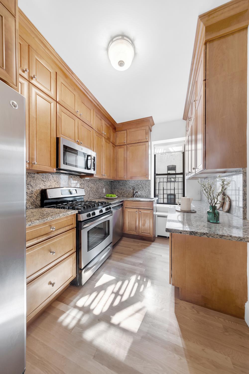The spacious living room is graced with high ceilings, beautiful classic wood moldings and trim, and large windows that invite warm natural light throughout the day. A separate dining area makes entertaining and everyday living equally comfortable. The primary bedroom boasts generous proportions and serene light, with excellent closet space throughout the home to keep things effortlessly organized. The two additional bedrooms provide smart flexibility for a home office, nursery, guest room, or creative space. The windowed kitchen with sleek GE Profile stainless-steel appliances, generous counter space, and an in-unit washer/dryer adds modern convenience to this timeless residence. Additional storage needs? Two spacious storage units are also included, providing the extra room every New Yorker needs. Enjoy the benefit of low monthly carrying costs, enhancing the home's value and affordability!