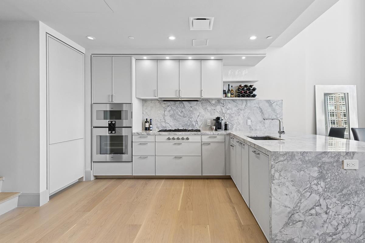 The open-concept layout features a custom Poggenpohl kitchen outfitted with polished marble countertops and a full suite of integrated Gaggenau appliances, ideal for both everyday living and elevated entertaining. The lofted primary bedroom offers space for a king-sized bed and includes a spacious walk-in closet and a 5-piece ensuite bathroom finished with radiant heated floors and refined fixtures. A secondary full bathroom on the first floor is clad in Aged Dark Nature stone, accented by Fantini hardware.
