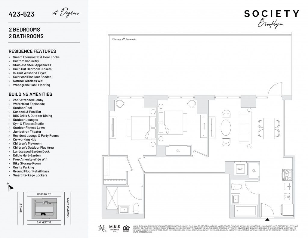 Now offering 3 months complimentary on an 18 month lease!Welcome to Society Brooklyn! Modern Elegance with Iconic Views on Brooklyn’s newest Waterfront Esplanade!Discover a new level of luxury at Society Brooklyn, where urban sophistication meets modern comfort along Brooklyn’s newest waterfront esplanade. Nestled at the intersection of Carroll Gardens and Park Slope, our residences offer an unparalleled lifestyle designed for those who crave both style and substance.Our thoughtfully crafted residences blend sleek, modern finishes with warm, livable design, perfecting the balance between elevated aesthetics and everyday functionality. Expansive windows flood each home with natural light, while select units offer breathtaking skyline and canal views that bring the beauty of Brooklyn right into your living room.Residences feature:• Spacious open concept layouts• Custom black oak kitchen with premium stainless-steel appliances • LG in-unit washer/dryer • Oversized windows and wide-plank flooring• Spacious Bathrooms with LED mirror light• Window roller shades: white 5% light filtering with blackout in bedrooms• Amazing ViewsSignature AmenitiesFitness & Wellness:Stay active in our expansive modern fitness center, including:• Cardio studio• Yoga & meditation studio• Training floor with a wide range of new Technogym strength and cardio equipmentDitch the private gym membership. We’ve got you covered for any workout need.Co-Working Hub:• Multiple private offices available 24/7 for residents• Designed to facilitate a comfortable and convenient work-from-home without the need to be in your homeUnwind or connect in multiple resident lounges, designed for both social gatherings and quiet relaxation.Our sprawling outdoor amenity deck is your warm-weather escape:• Resort-style pool with sundeck• Pool bar & fire pits• BBQ grills with al fresco dining setups• Outdoor yoga, fitness, and lounge zonesExperience modern elegance with iconic views• Rooftop terrace offering panoramic, 180-degree city views• Many units boast stunning skyline viewsDaily Convenience• Attended parking garage• Secure bike storage• Package room & concierge services• 24/7 Lobby ConciergeWaterfront Park & Esplanade• Access to an expansive waterfront park and esplanade with landscaped walking paths, seating areas, and stunning views • A vibrant gathering place with dining options, shops, and embracing the arts communityEqual Housing Opportunity.Photos, Videos, and/or 3D tours may reflect a similar unit rather than the specific listing.