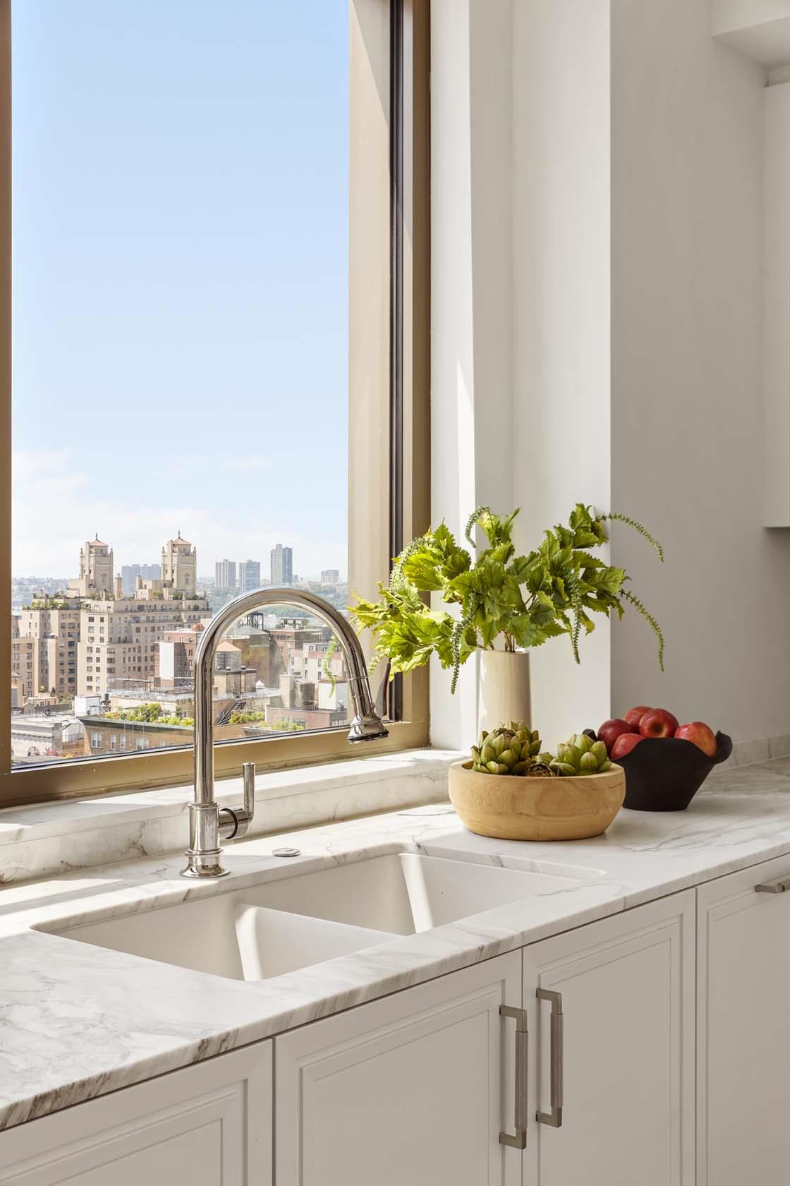 The windowed kitchen is a chef’s dream, featuring Crema Delicato marble countertops, matte lacquer cabinetry by Aster Cucine, and integrated Gaggenau appliances. The north- and east-facing primary suite includes two walk-in closets and a five-fixture en-suite bath finished with Calacatta Gold marble slab, mosaic accents, and a freestanding soaking tub by Waterworks.