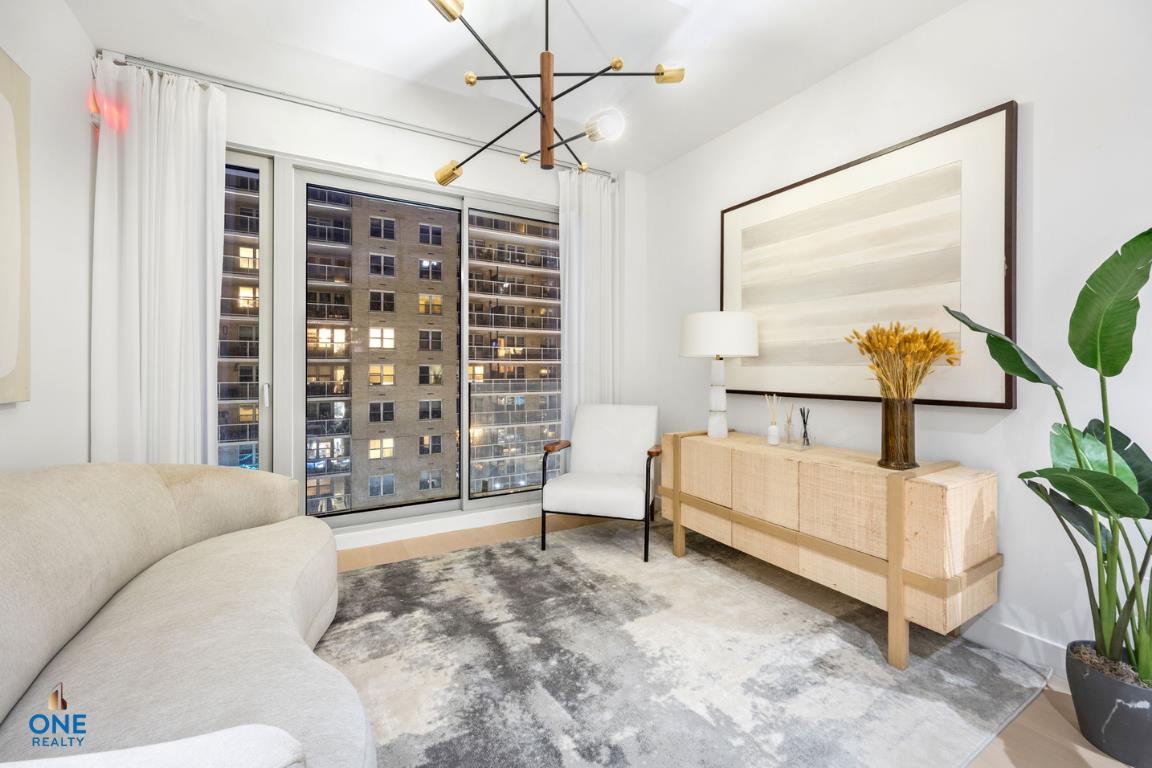 Enter Residence 9A, a spacious and airy two-bedroom sanctuary filled with natural light pouring through floor-to-ceiling oversized windows. The open kitchen is a culinary masterpiece, featuring pristine marble countertops, a striking backsplash, and an island complemented by sleek white lacquer cabinets. Integrated high-end appliances, including a Thermador refrigerator and Bosch dishwasher, ensure a seamless cooking experience. Every residence is thoughtfully equipped with central air conditioning, an in-unit washer and dryer, and a smart entry lock for your convenience.