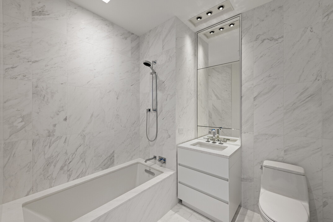 The primary suite is an elegant retreat, complete with a walk-in closet and spa-inspired bathroom featuring radiant-heated floors, a double vanity of Calacatta Borghini marble, and a deep oval soaking tub overlooking the dramatic downtown skyline.