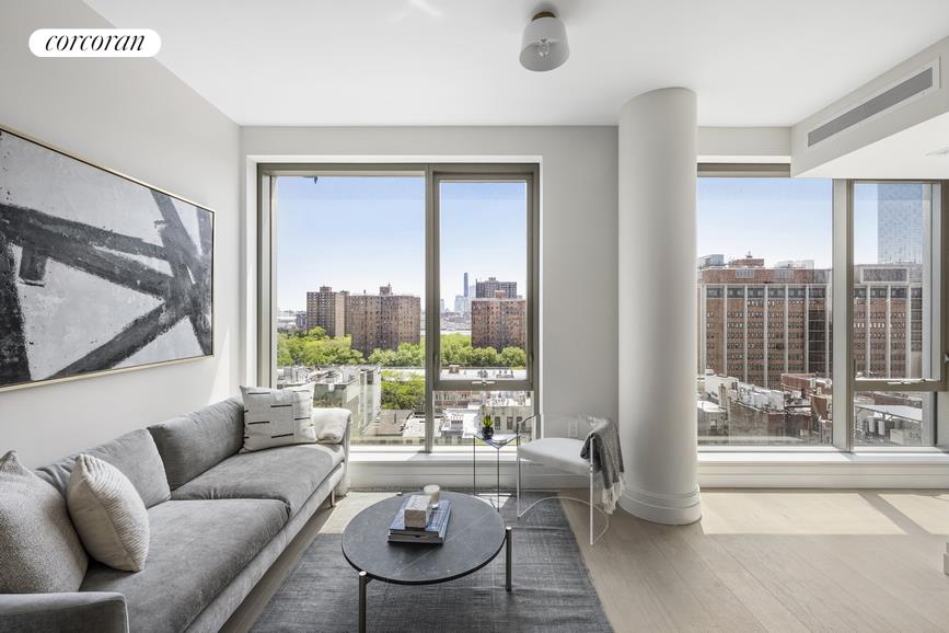 This light filled 564SF one bedroom has open views to the South East with massive windows which give way to picture perfect river views . The primary bedroom is nicely sized with a large closet and overlooks historic East Broadway.