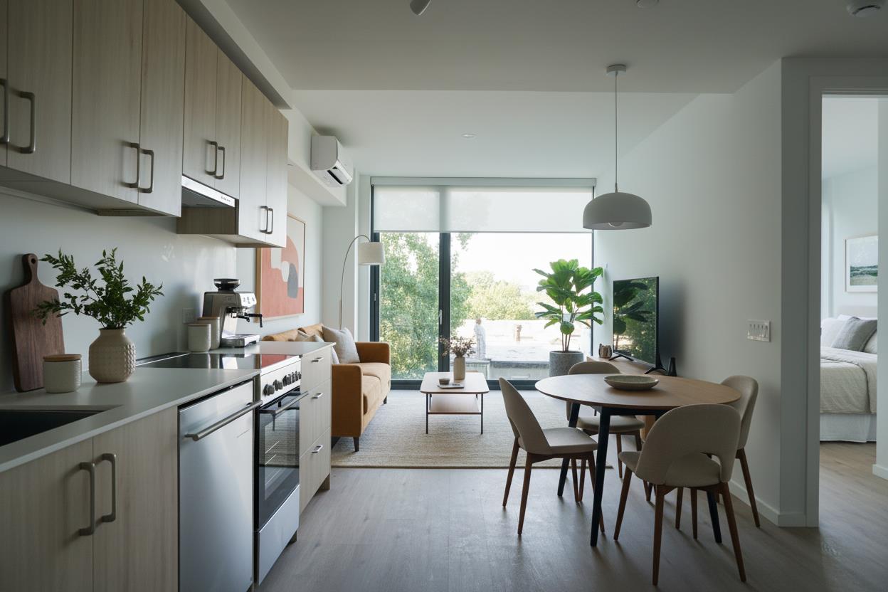 Residence 14 is a rare two-bedroom home offering both thoughtful interior design and exceptional private outdoor space. The open living and dining area connects seamlessly to the kitchen, creating an inviting flow that extends out to a large private terrace, perfect for entertaining, relaxing, or enjoying the outdoors in total privacy.