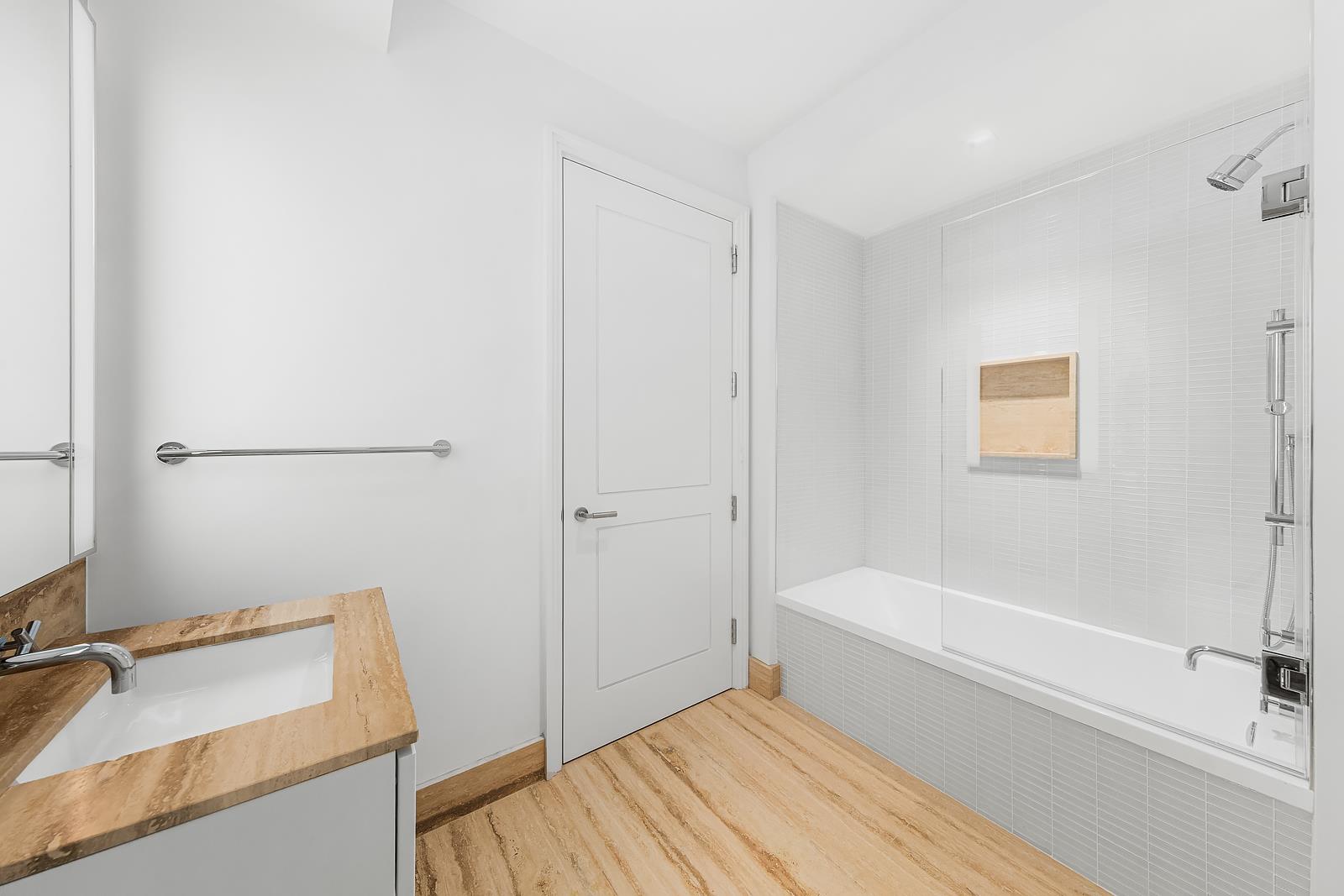 Warm stone primary bathrooms feature large soaking tubs and heated floors. The building’s one-of-a-kind residences maintain the integrity and character of the 1930s scale, a modern take to art deco detailing, and boast ceiling heights over ten feet throughout with wide-plank French Oak hardwood floors underfoot.