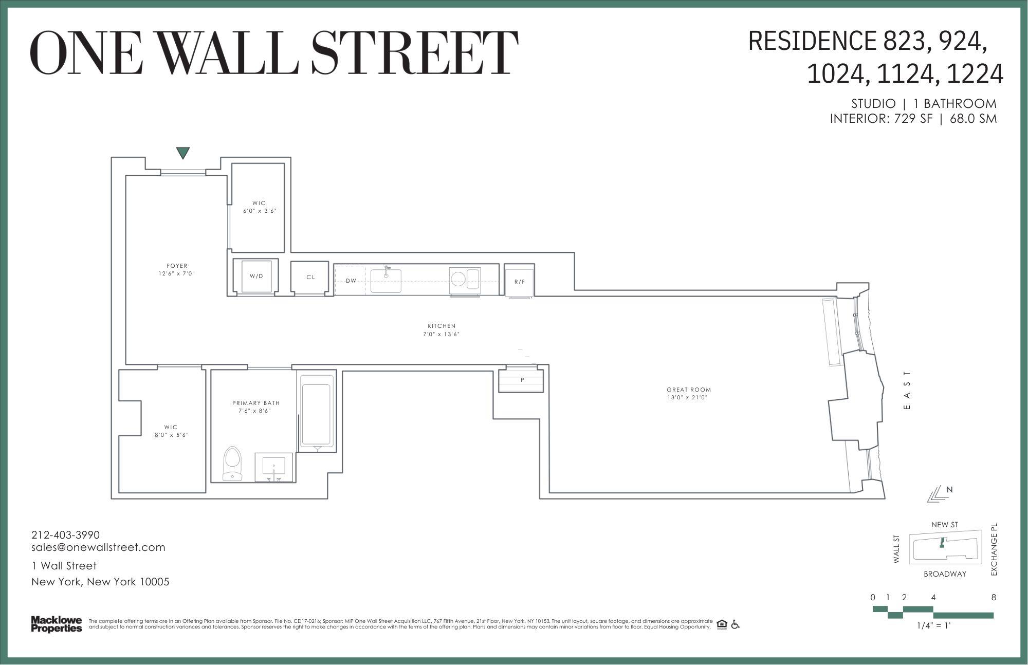 • Move In Ready! Residence 823 is an alcove studio with home office at One Wall Street. 823 is a spacious layout, alcove studio home with a separate kitchen. Located in the Eastern facing section of the building, this home offers natural light, and ample closet space. Custom kitchens and baths pair seamless technology with classic elegance. The Kitchen features Oceanwood marble slabs which rests on custom Aran Cucine cabinetry, accented by white glass panels and satin nickel finishes and is the perfect blend of beauty and function.
