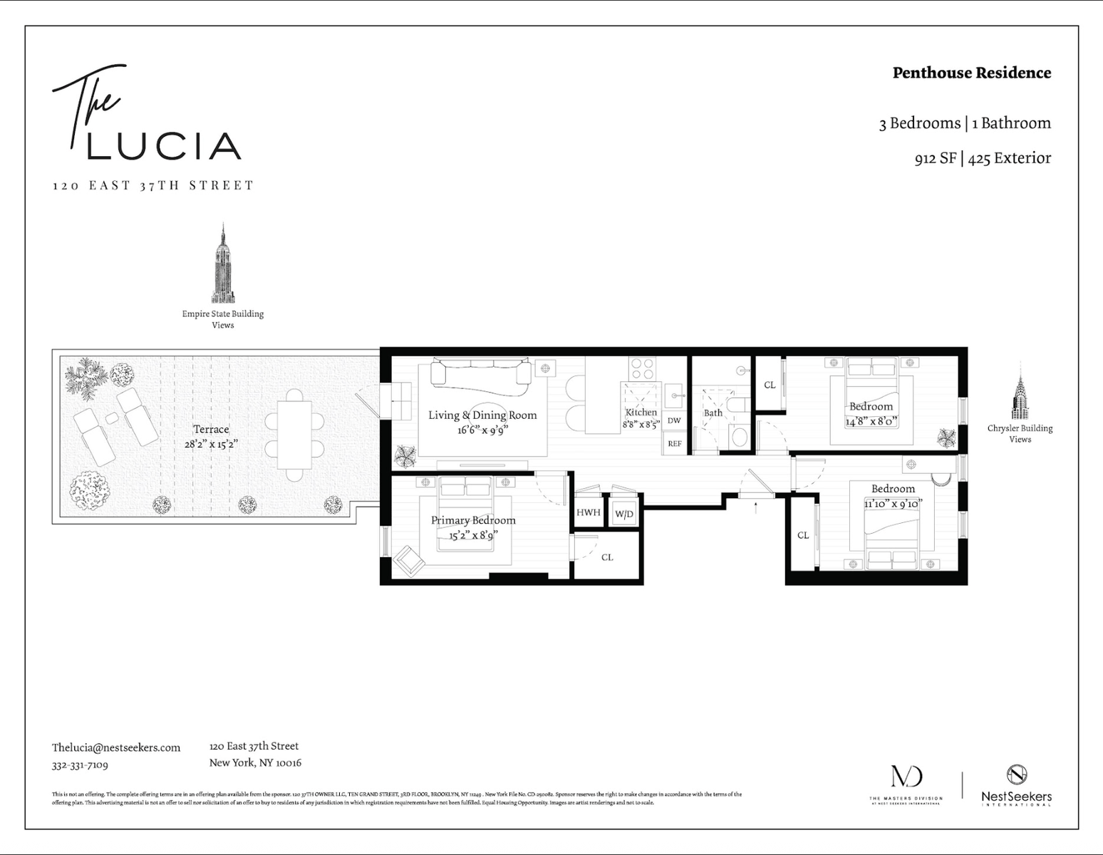 Introducing this luxurious 3-bedroom, 1-bathroom penthouse at The Lucia, an exceptional new boutique where modern refinement meets Gilded Age charm in the exclusive Murray Hill Historic District. Beneath an exquisite brownstone, brick, and terra cotta fac¸ade, this special home captures the essence of townhouse living moments from exciting dining, shopping, and culture in prime Midtown Manhattan. A private terrace offers rare outdoor space and the perfect place to entertain, grill, sunbathe, and more. Tall sash windows, wide plank hardwood floors, and gleaming fixtures run throughout a spacious open-concept layout. The skylit eat-in kitchen blends custom two-tone cabinetry with rich stone countertops and a matching backsplash. Matte black hardware and a Brizo faucet balance a stainless steel Kohler sink and integrated appliances from Bosch, Summit, and Fulgor Milano. The sun-drenched primary suite has a deep walk-in closet and overlooks the terrace, while the second and third bedrooms have reach-in closets and lovely Chrysler Building views. The skylit three-piece bathroom includes matte black fixtures and Everlast Arabescato porcelain tile walls and floors. A custom floating vanity sits beneath an inset mirrored medicine cabinet, and a wall of glass reveals a walk-in shower. An in-unit washer/dryer completes the home. Originally built in 1891-1892 by Romeyn & Stevens for James C. Fargo, The Lucia is a marvelous Renaissance Revival townhouse composed of 7 captivating studio-to-3-bedroom residences. The Lucia sits on one of the prettiest, quiet, and centrally located tree-lined streets in Murray Hill. The Morgan Library, Scandinavia House, the Empire State Building, Koreatown, Herald Square, Grand Central Terminal, and Bryant Park are all within a few blocks. Residents also enjoy easy access to numerous restaurants, bars, and cafes as well as iconic shopping along 5th and Madison Avenues. Nearby subway lines include the 4/5/6/7/B/D/F/M/N/Q/R/W. Pets are welcome.