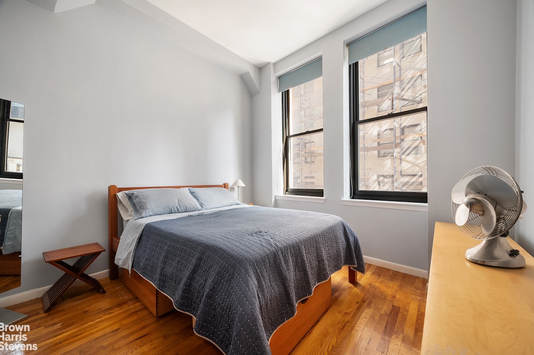 The mostly open layout with large living/dining area allows for great flexibility in designing this home, and could easily accommodate a second bedroom and/or a home office. The oversized (7x4ft) windows offer deep views over rooftops and give the space an airy, open feel that defines classic loft living. Beautiful hardwood floors run throughout the space, while a perfectly sized separate kitchen is outfitted with stainless steel appliances, including a Bertazzoni range, Liebherr fridge and GE Monogram dishwasher.