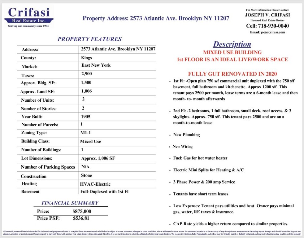 • This beautifully Gut Renovated mixed-use property offers an ideal live/work space. The spacious duplexed studio, spanning approximately 1,400 sq. ft., includes a kitchenette, bathroom, and access to a full basement which is included with the unit. Vacant upon closing, allowing for flexible occupancy. The second-floor unit, approximately 750 sq. ft., features a well-appointed kitchen, a bright living room, two bedrooms, and a full bathroom. The apartment boasts gorgeous wood floors, three skylights that flood the space with natural light, and access to a private deck and rooftop space. The Current tenants pay $2,500 per month and their lease expires on 6/30/25. Both units are equipped with mini-split systems for efficient heating and cooling, ensuring year-round comfort. This property has been thoughtfully renovated with all-new wiring, plumbing, and mini-split systems. Additionally, it is upgraded with 3-phase power and 200A service, offering optimal electrical capacity for modern needs.