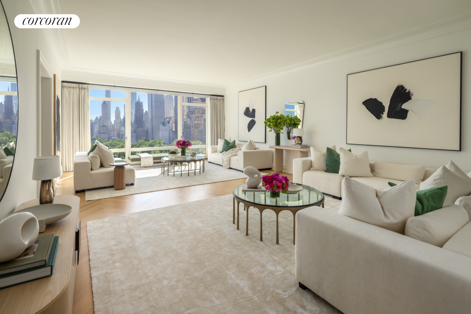 Perfectly located on the 14th Floor in the exclusive "House" section of 15 Central Park West, this spectacular sun-flooded Robert A.M. Stern residence boasts panoramic views of Central Park and the iconic Manhattan skyline. With over 47-feet of frontage and seven oversized windows, the living room, dining room, and primary bedroom all face directly onto Central Park. The luxurious home spans approximately 3,364 square feet with four bedrooms (or three and a library) and three and a half renovated bathrooms. There are 10-foot ceilings, floor-to-ceiling windows, hardwood floors, and central air conditioning with a thermostat in each room. There is an outside guest/staff suite on the sixth floor that is approximately 455 square feet with 11 foot ceilings and its own kitchenette and bathroom. It has additional monthly common charges of $1,134 and monthly real estate taxes of $779.