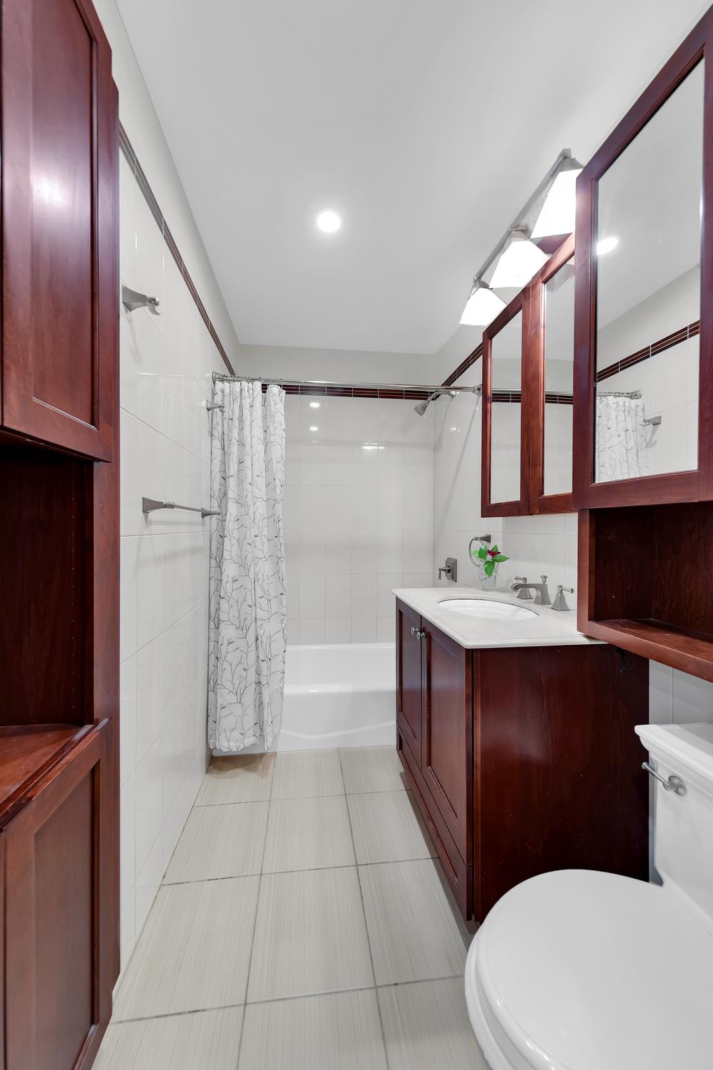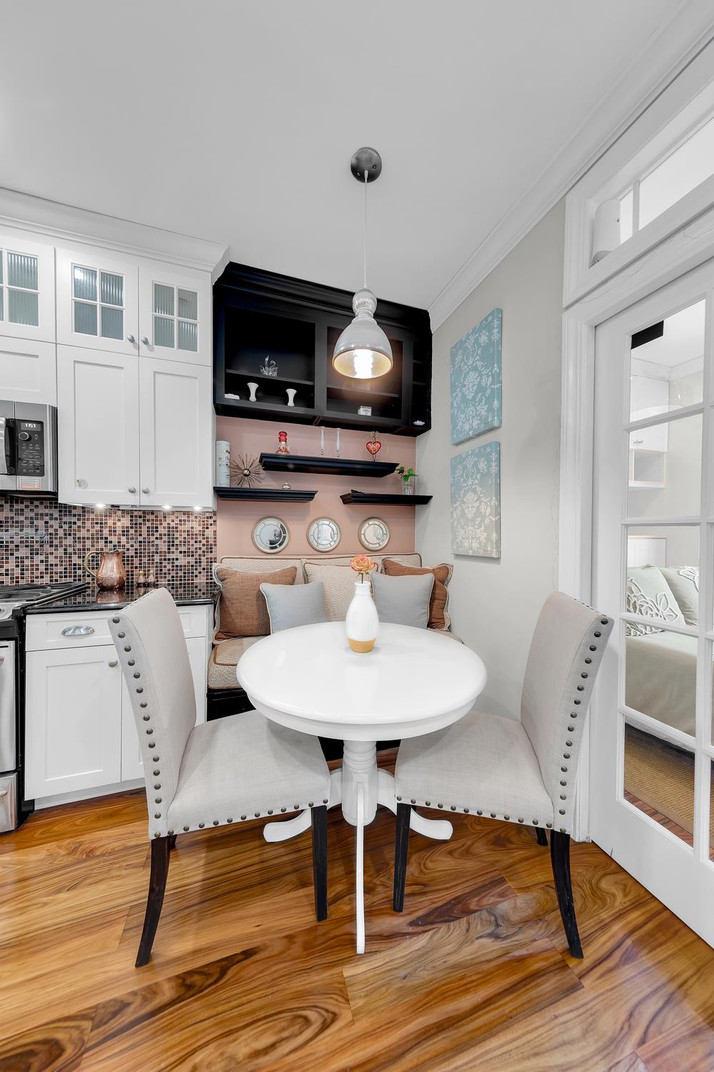 This extra-wide apartment shines with functional elegance. It features beautiful, custom-built shelving and storage throughout, effortlessly eliminating clutter. The kitchen is a storage dream, boasting massive floor-to-ceiling cabinetry and a handy built-in dining nook. Versatile French pocket doors offer flexibility in dividing the living space.