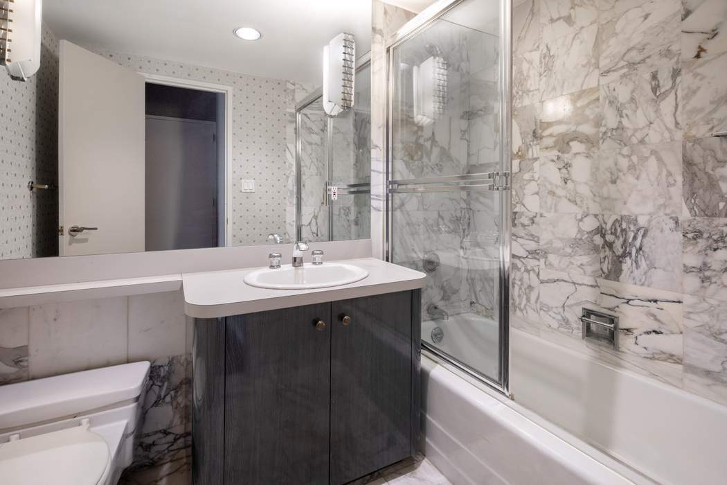 A Library / private Guest Suite features custom cabinetry, Service Bar and full Bath. The large Eat-In Kitchen is outfitted with a Double Viking Ovens with vented hood, a stainless-steel Sub-Zero Refrigerator and a Miele Dishwasher. A stone breakfast bar is positioned along the southern wall of windows, providing views of the green and verdant United Nations Gardens and East River. Nearby is the Butler’s Pantry and Laundry with a Mielle Washer and Dryer and a Service Entrance. This wing also offers a large Bedroom with en-suite Bathroom. A Powder Room completes the entertainment and public space on the Main Floor.