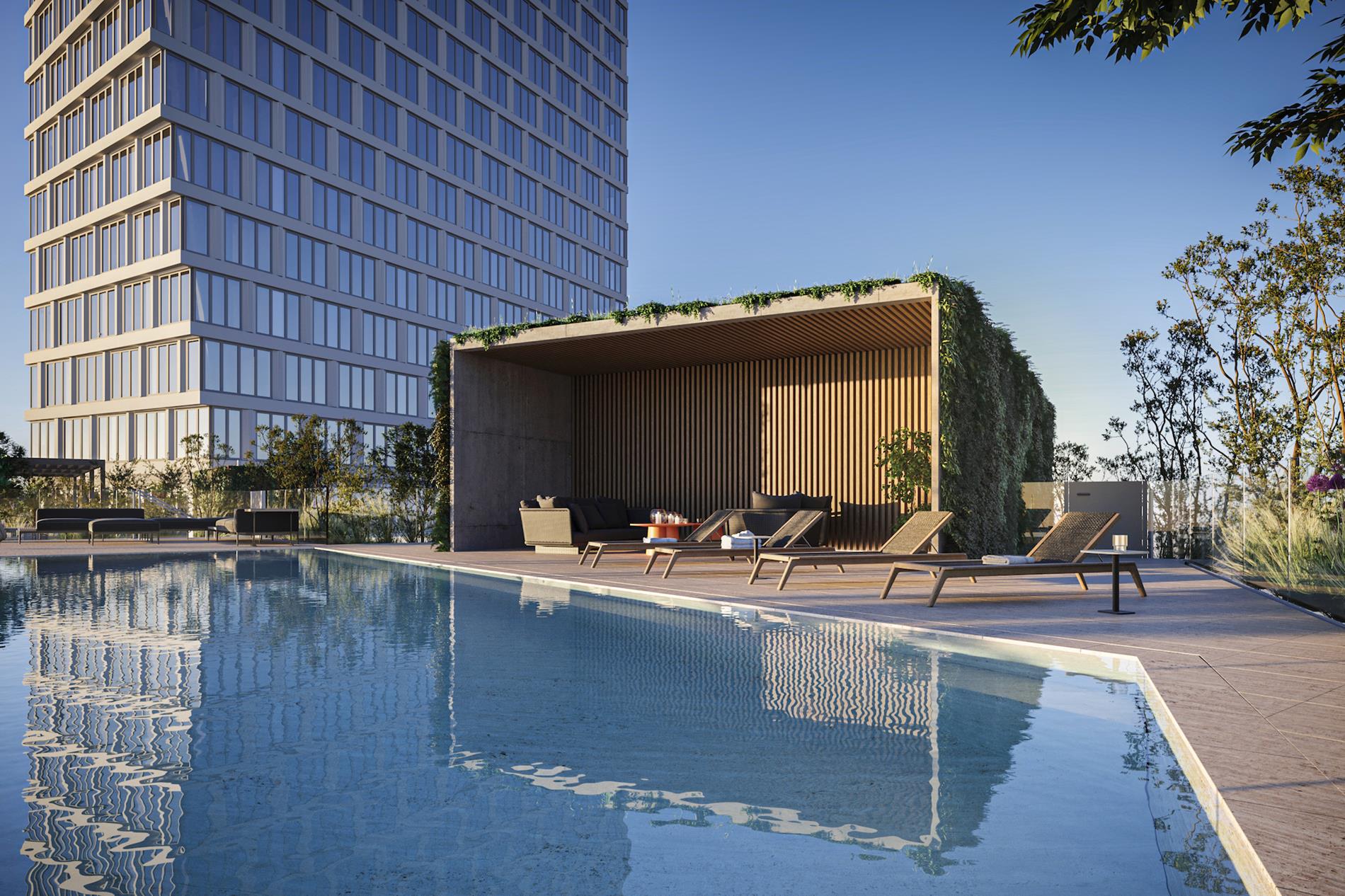 The building's amenities include a bright fitness center, yoga room, game room, golf simulator, private work spaces, rooftop sun deck, and a private saltwater pool.