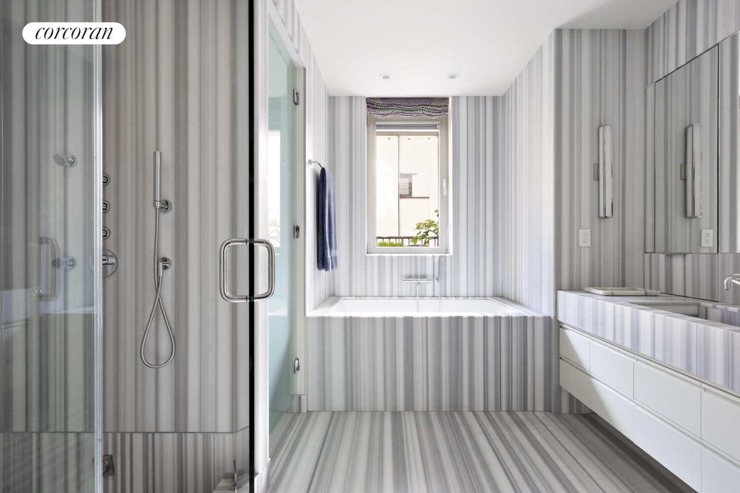 The primary suite is a sanctuary unto itself, with three exposures, direct terrace access, two custom walk-in closets, and a spa-inspired five-fixture bathroom featuring a deep soaking tub and multi-jet shower. Two additional bedrooms, each with en-suite bathrooms, overlook the southern terrace and offer comfort and privacy for family or guests. Additional highlights include a washer/dryer, built-in storage, and custom finishes selected with an elevated, cohesive design vision.