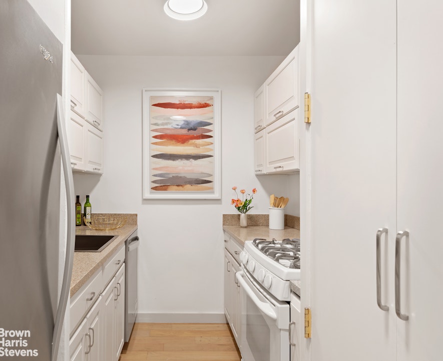 As you enter this home, you are greeted by a wall of massive picture windows showcasing open views to the North, capturing a glimpse of the East River. The entire home is bathed in glorious sunlight, and brand new floors which run throughout the entire apartment. The sprawling living/dining room easily accommodates full-sized furniture and a traditional dining table, perfect for those who like to entertain or simply enjoy extra living space. There is a wall of deep walk-in closets which can alternatively be converted into a home office setup or remain as they are for expanded storage space.