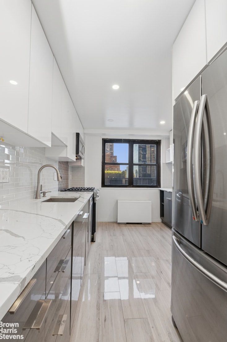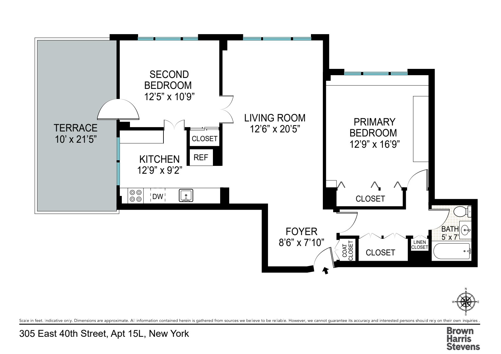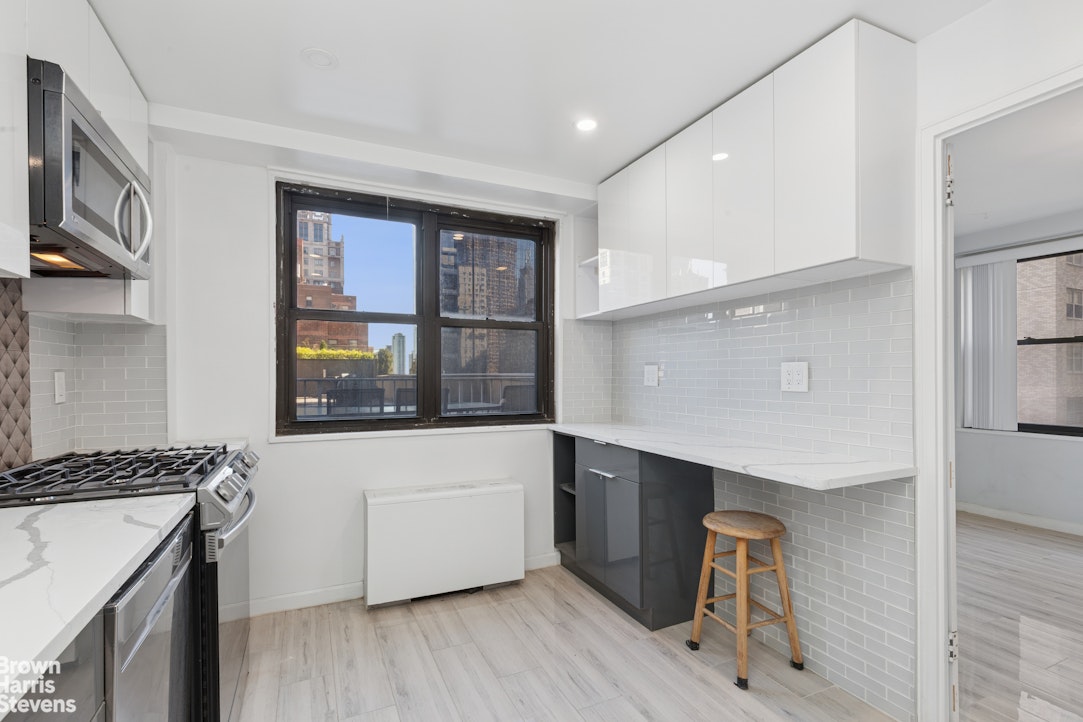 With a generous 1,000 square feet, this two-bedroom, one-bathroom home boasts a beautifully renovated interior that exudes both comfort and style. Enter inside and soak in the abundant natural light that floods through the modern eat-in kitchen complete with stainless steel appliances, sleek cabinetry with plenty of storage, double windows for airy vibe and views of Tudor City. The adjacent bedroom opens up to your private 200 square foot terrace where you can enjoy the magnificent city and skyline views making it an ideal space for unwinding after a long day.  The spacious living/dining room is fit for hosting guests or enjoying cozy evenings in. The large primary bedroom which can easily accommodate a King-sized bed boasts large closets and built ins for a clutter free lifestyle.
