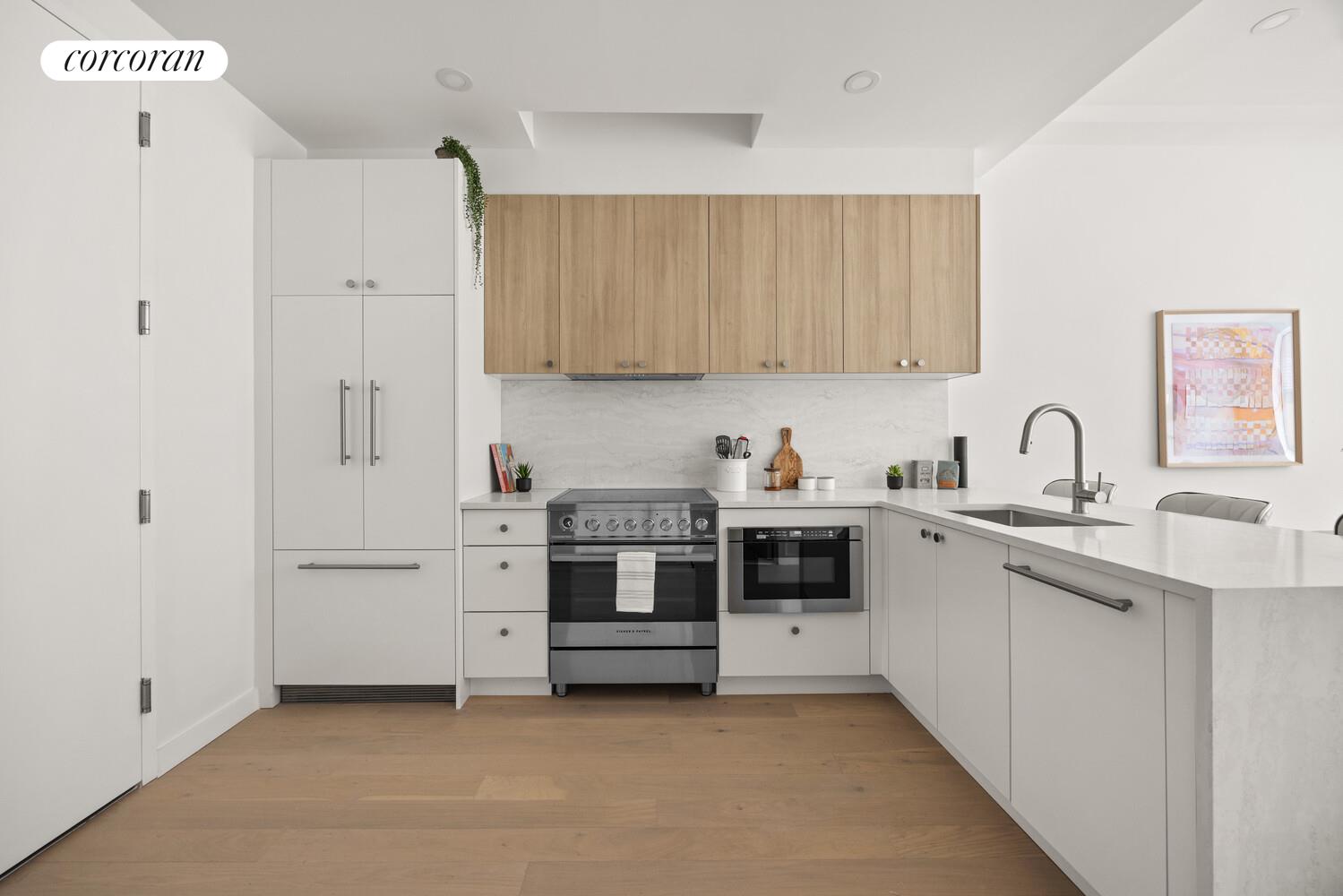 The custom kitchen is sleek and minimalist, equipped with top-of-the-line Fisher & Paykel appliances, including a paneled refrigerator, dishwasher, and microwave. Custom cabinetry and quartz countertops, creating a refined yet inviting aesthetic.