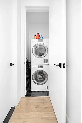The bedroom features a large window and generous closet space, while the modern bathroom includes a soaking tub and under-sink storage. For added convenience, there is in-unit laundry tucked away in a dedicated closet.