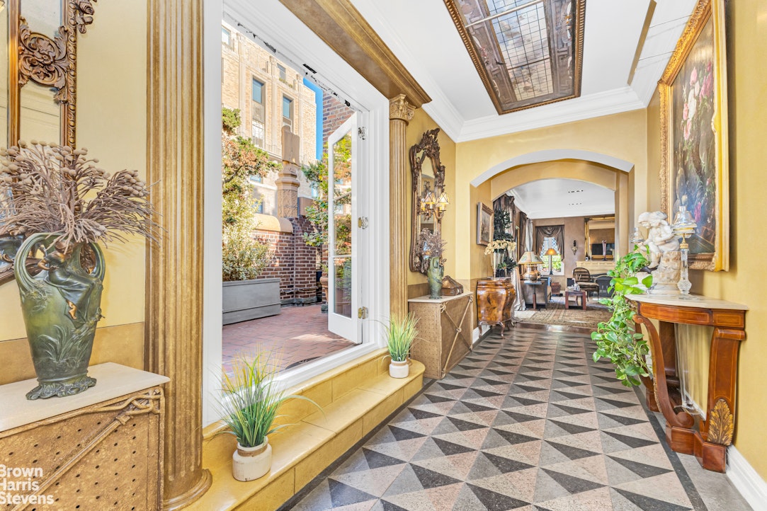 Inside, the 11th floor unfolds with 10-foot ceilings, a wood-burning fireplace, hand-pegged oak floors, and a rare continuity of light and air, with French doors in every room opening onto the terrace. A dramatic 60-foot-long arched gallery creates a natural rhythm between the formal living and dining rooms, perfect for grand entertaining. The stately dining room looks onto the garden terrace, while the windowed chef's kitchen-finished in rich mahogany and granite-offers both craftsmanship and comfort. A powder room with skylight and a flexible staff room (currently used as an office) complete the upper level.