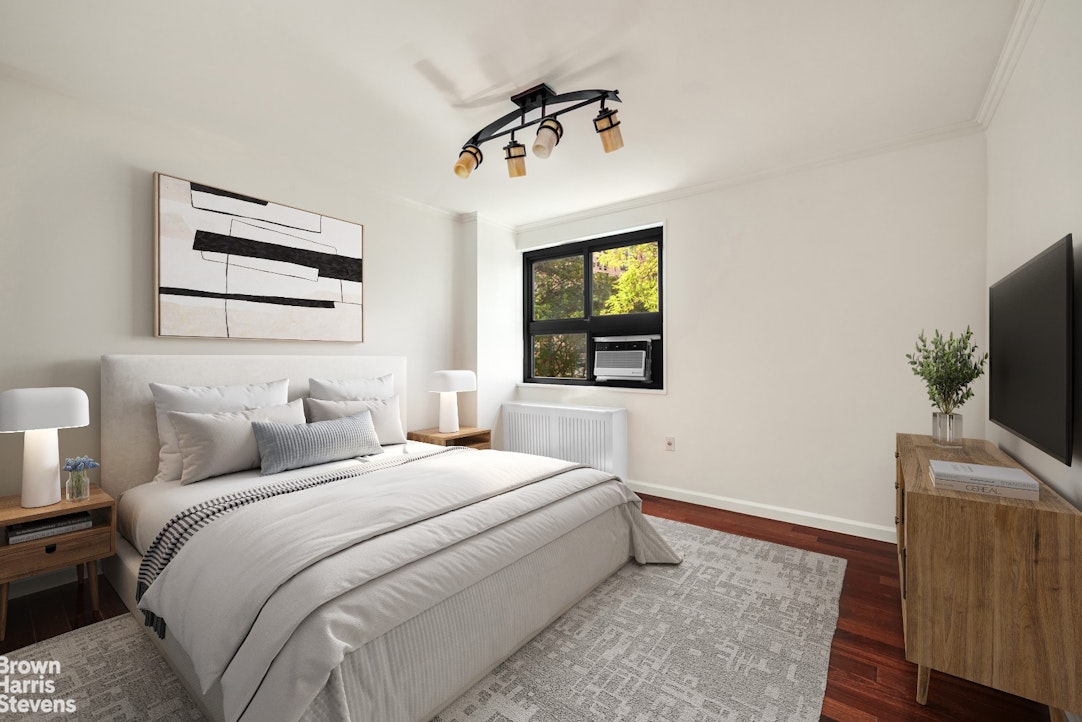 Two large bedrooms featuring sunny windows and spacious California Closets flank the spa-like full bathroom. Luxurious hardwood flooring paves the home, radiators throughout feature beautiful custom-crafted maple covers, and with five large closets in total, storage will never be a concern in this perfect two-bedroom home.