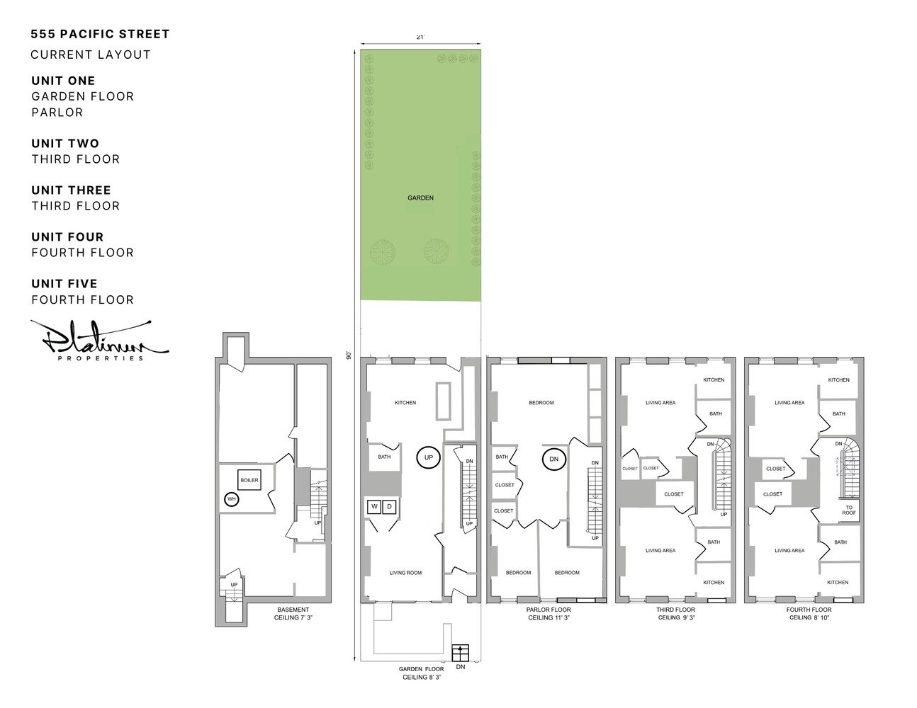 The building is the tallest on the block, standing nearly 44' tall. It sits on an oversized 21-feet wide lot and possesses buildable floor area for expansion, making for near limitless opportunities. The 1910 structure currently spans five levels and 3,360 square feet of livable space. Unused FAR allows an additional 420 square feet for a potential final product with 4,800 square feet of total indoor area to enjoy.The excellent condition of the exterior highlights the key components for a successful renovation. In place are high parlor ceilings of 11'3" and exceptionally tall top floor height of 8'10. Very significant is the presence of a fully dug cellar with 7'3" ceilings already in place.