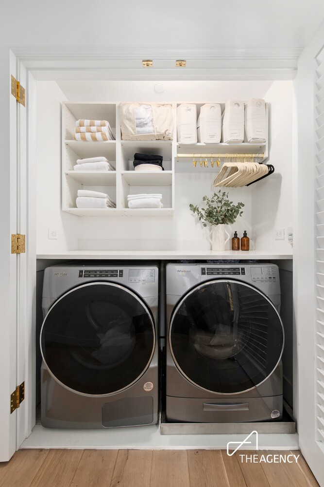 The primary bedroom includes a large closet with custom build-outs, and an en suite bathroom with double vanity and marble finishes. Two additional bedrooms provide flexibility for guests, a home office, nursery, or creative space. A second full bathroom, in-unit washer and dryer with dedicated folding space, and multiple storage options complete the home. Both bathrooms feature radiant heated floors.