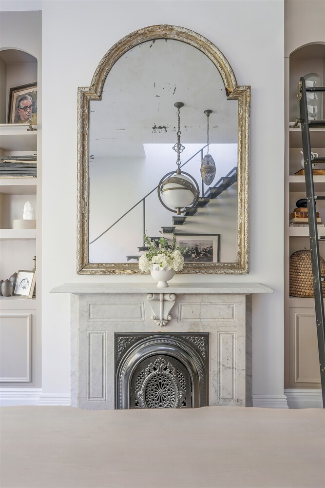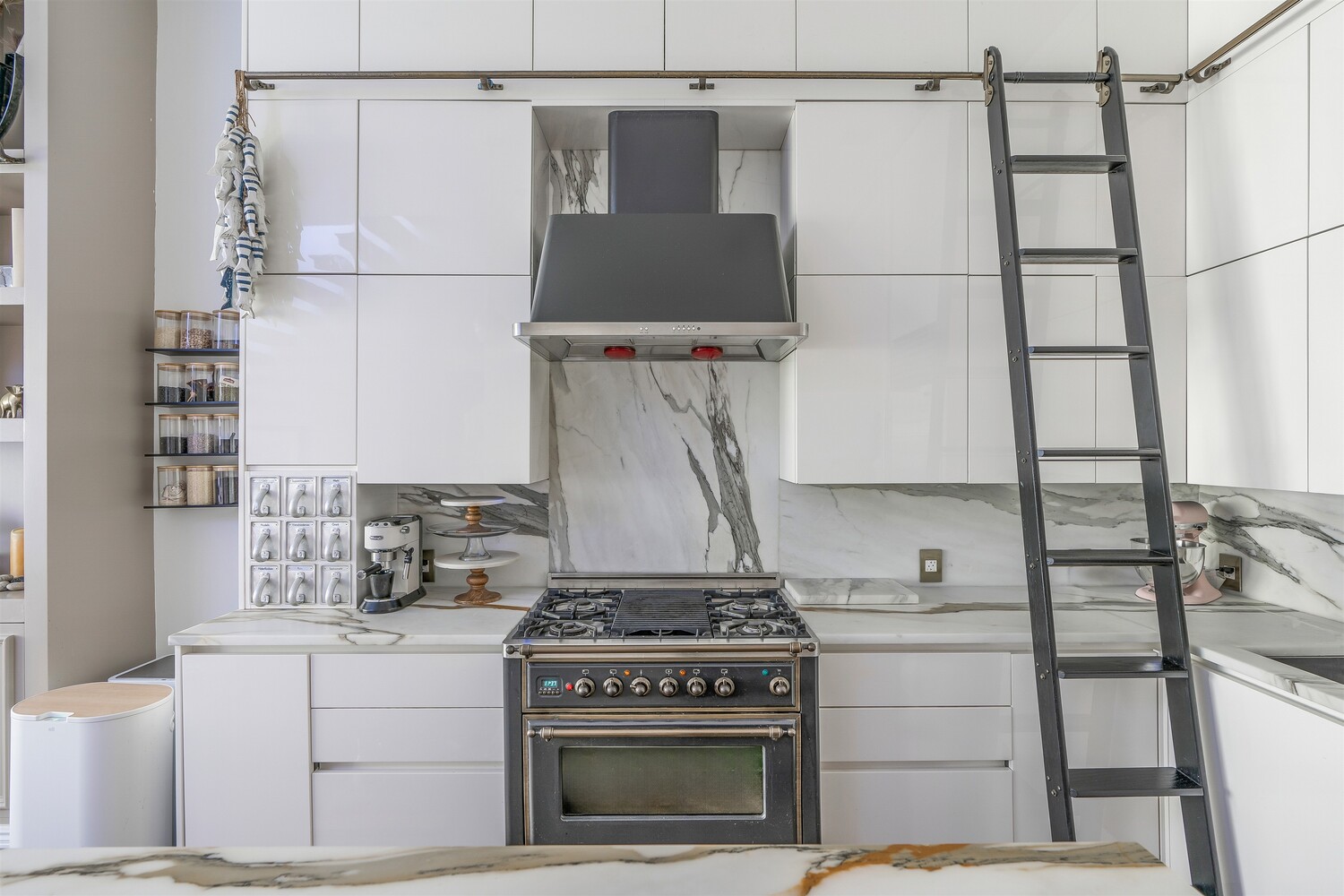 The sun-filled great room serves as the heart of the home, with an elegant open layout that includes a dining area and a chef's kitchen anchored by a wood-burning fireplace framed by tall custom built-ins. The marble-clad kitchen is a showpiece, featuring a Sub-Zero refrigerator, 4-burner gas range with grill, deep stainless-steel sink, and an expansive island with a secondary prep sink. Floor-to-ceiling cabinetry provides exceptional storage and is accented by a charming rolling ladder.