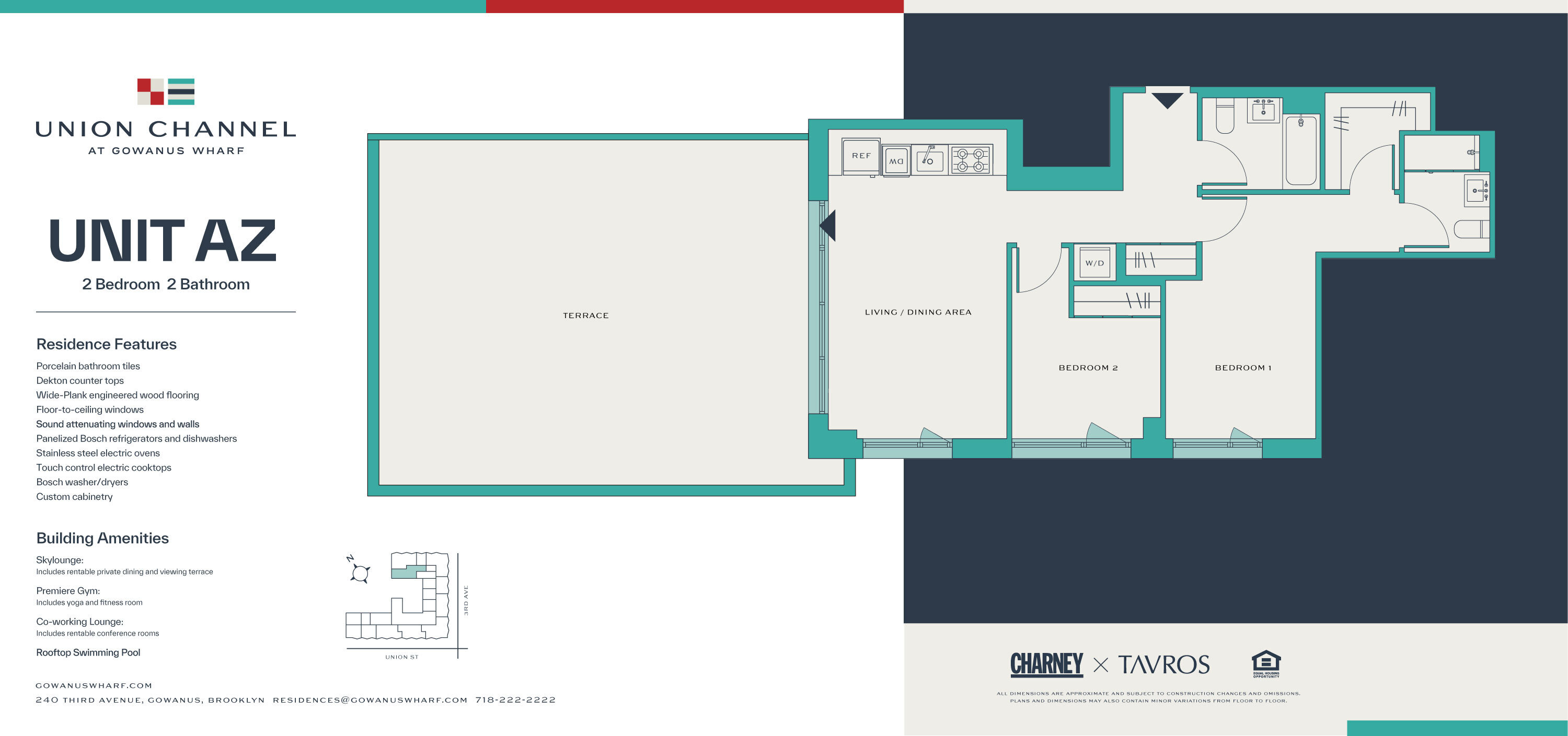 Union Channel marks the debut of Gowanus Wharf’s campus of residential buildings in the heart of Gowanus, Brooklyn. Situated on the corner of Union Street and 3rd Ave, Union Channel is a collection of 224 apartments, easily identifiable by its undulating facade and metal paneled angular-shaped bay windows, and one block from the R train and just 3 stops into Manhattan. *Residences* Designed by Fogarty Finger architects, the uniquely crafted residences promote balance in pursuit of the living ideal. Inspired by a neighborhood flowing with artists, creatives, and culture, Union Channel is an ode to the enduring spirit of Brooklyn and no detail has been overlooked. From work-from-home to hosting friends, every apartment is built with intention. Apartment features include open and airy layouts, island kitchens, panelized appliances, industrial countertops, wide-plank flooring, floor-to-ceiling windows, European-like balconies, and ample closet space. *Amenities* The Drift Club at Union Channel is for those seeking a balanced lifestyle and exclusive access that extends outside the walls of the building. Featured amenities include: -24/hr Doorman + Concierge -Premier Fitness Center + Yoga Room with regular classes and programming -Work From Home Lounge -Skylounge with Private Dining and Viewing Terrace -Rooftop Pool with Skyline Views -Landscaped Roof with Bocce, Cornhole, Bar, and BBQs Our connection to the community is equally important. We’ve created a custom Gowanus Wharf App designed to bring what matters most to your fingertips. On the app, access your complimentary Brooklyn Museum membership, join interest-based community groups, create and attend local events, reserve amenities, open your apartment, sign up for fitness classes, meet your dog concierge, and much more. In a city where change is the constant and the constant moves at hyperspeed, development doesn’t need to be a dirty word. Our mission is to activate a residential and retail experience that is an authentic expression of our locale. That catalyzes community, culture, and sets a new standard for city living. Gowanus Wharf is designed to achieve the perfect balance of art and commerce, nature and digital integration, and legacy and transformation. A tribute to the enduring spirit of Brooklyn, The Wharf is a stage built for residents, retailers, and visitors to pursue their living ideal. From a place of balance, the most important things in life come into focus. Upfront fees: Application fee: $20 per application Security deposit: $1,000 for qualified applicants Amenities: $100pp + $500 annual pool fee (ask about any specials!) Storage fee: $100 (optional) Bike storage fee: $25 (optional) Risk Protection fee: $20 Parking (optional): $400 (optional) Residents are responsible for electricity payments based on usage