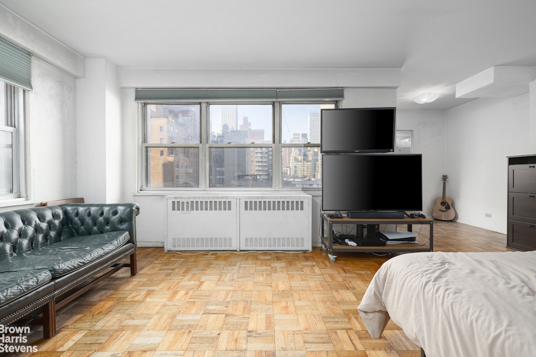 The elevator goes whoosh, your key clicks, and you slip into a serene second-from-top, corner alcove studio where, facing the inside of the block, the city's bustle quiets to a gentle background hum. A sunset-soaked sanctuary, it gazes west and south with clear view of the Empire State (winking at dusk) and the stately Langham--views that blush gold, then rose, then velvet blue. Light pours in; in it, the room expands.