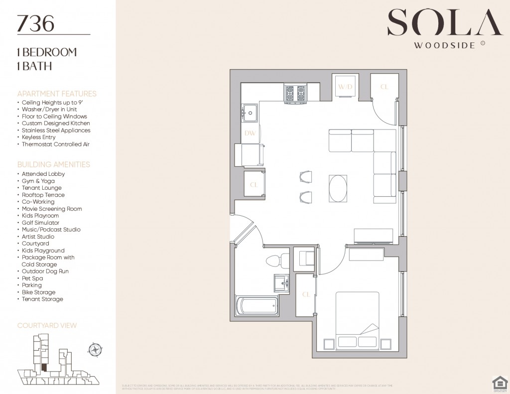 One Bedroom One Bathroom Available in WoodsideWelcome to SOLA® : Where Luxury Meets ComfortDiscover modern living at SOLA, where our thoughtfully designed apartments offer a seamless blend of style and functionality. From cozy studios to spacious three-bedroom residences, SOLA has a home to suit various lifestyles, and we also offer fully furnished apartments!Our units features:• Quartz countertops• Stainless steel appliances• Dishwasher• Floor-to-ceiling windows• Washer/Dryer in unitOur Building features:• Elevator• Storage Cages• Bike Storage• Package Room• Dog Park• Attended Lobby• Butterfly MX• Music Room• Childrens Playroom:• Screening Room• Fitness CenterDiscover Woodside, Queens: Your Gateway to Vibrant Urban LivingExperience the best of New York City living in the charming neighborhood of Woodside, Queens. Nestled in the heart of the borough, Woodside offers a unique blend of rich cultural heritage, varied dining options, and convenient city access.Images & tours are for illustrative purposes and may not reflect the exact unitEqual Housing disclaimer and SOLA® is a registered service mark of Sola Rentals QOZB LLC, and is used with permission*At lease signing, upfront move-in costs include a security deposit equal to up to one month’s rent, an application and credit report fee of $20 per applicant, a guarantor application and credit report fee of $20 per guarantor application (if applicable), and a third-party guarantor policy fee as charged by the third party (if applicable). Additional fees include monthly electric utilities as charged by a third-party meter company, WIFI as charged by a third party, and furniture rental ranging from $75 to $200 per month depending on the furnishings. Third-party furniture rental or purchases are charged as per the third party. Storage units range from $125 to $200 per month based on size, and bike storage is $20 per month. There is a $75 per month per person amenity fee. Private events in amenity areas cost $250 to $1,000 per hour per space. A refundable pet fee of $250 per pet is required. Key replacement costs $50 per key for lost or damaged keys. A late fee of $50.00 or 5% of rent, whichever is less, applies. Lockout fees range from $40 to $80 based on the time of day. A check bounce incurs a $50 fee. The pet wash machine costs $10 per 15 minutes. Laundry in the cellar is $3 per wash cycle and $2.75 per dry cycle. Legal fees are applied as permitted by law and the lease. Credit card transactions currently incur a 3.5% fee per transaction by the third party, subject to change without notice. Any damages caused by the tenant or tenant’s guest beyond normal wear and tear are billed accordingly.Additional fees may apply, such as but not limited to amenities, pet fees, application fees etc.