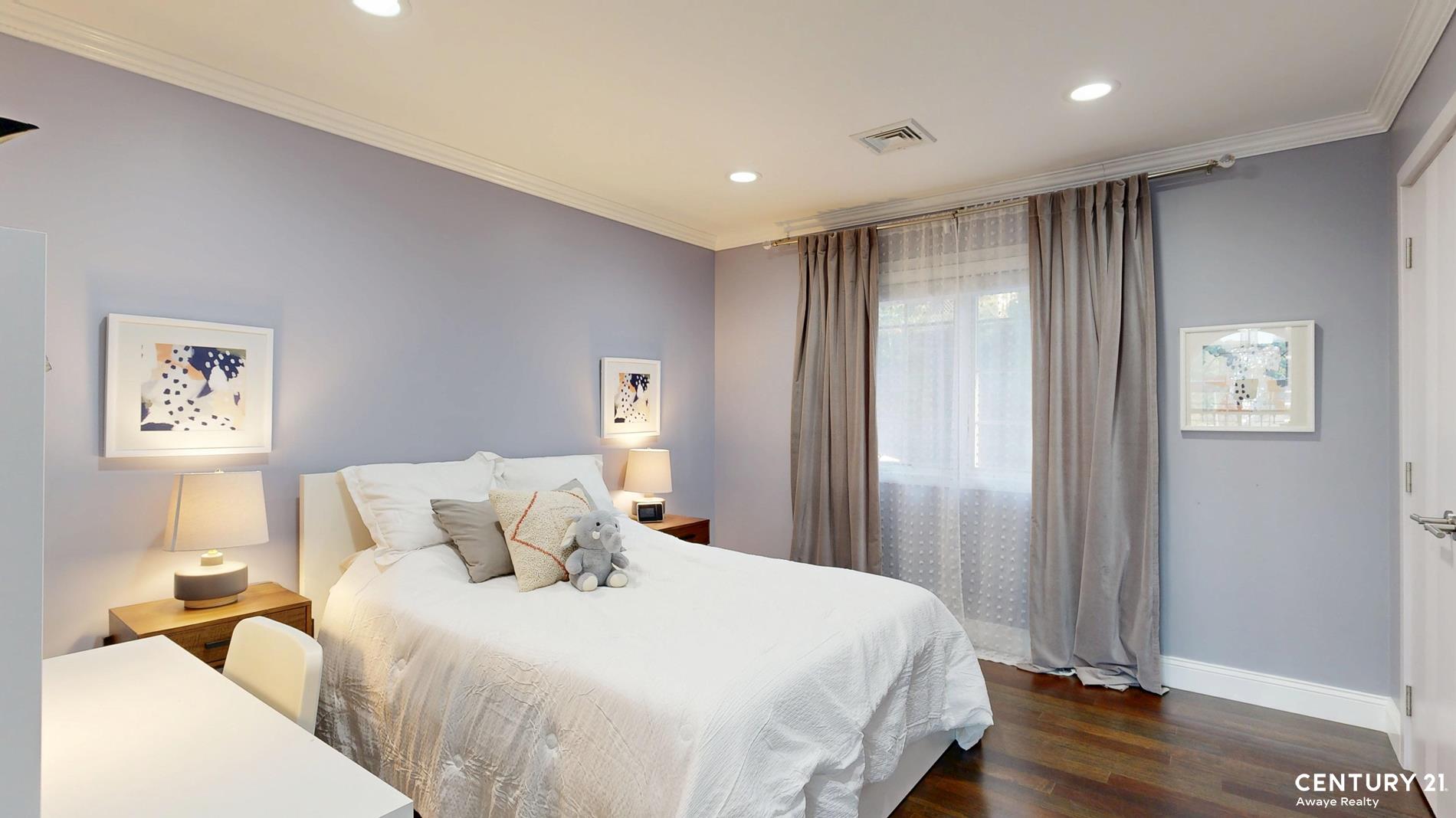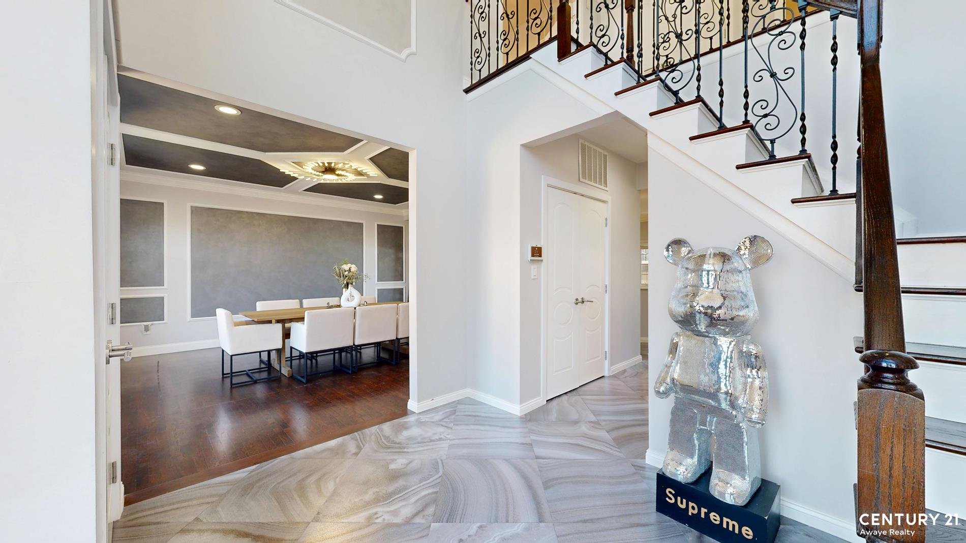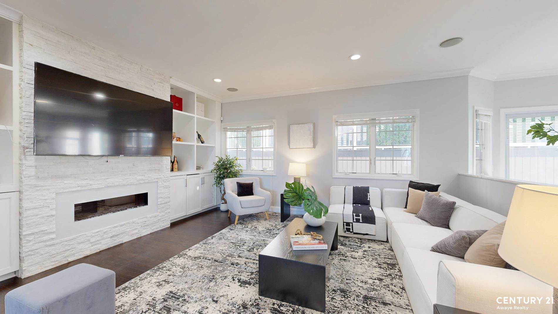 Step through the grand double doors into a home adorned with beautiful crown moldings, vaulted ceilings, and luxury hardwood floors throughout. The spacious living room is highlighted by an electric fireplace, creating an inviting ambiance for both relaxing and entertaining. This residence boasts six generously sized bedrooms, including a primary suite with a spa-like en-suite bathroom, and three additional exquisitely renovated bathrooms, all designed for comfort and elegance.