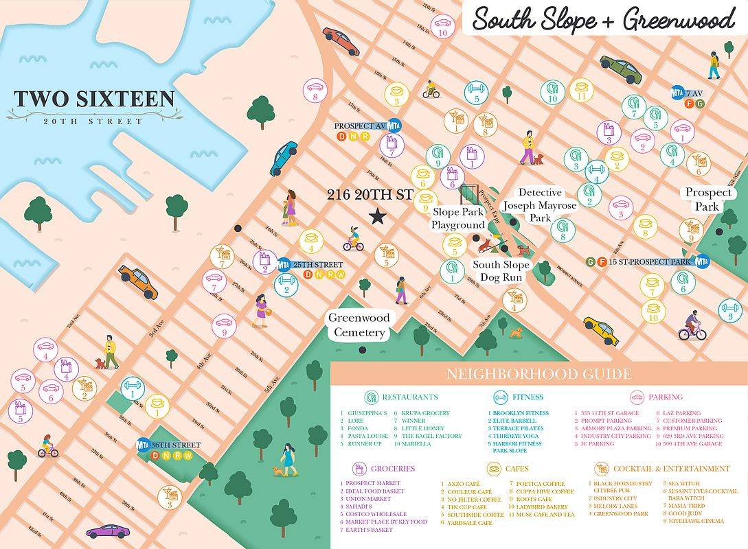 Ideally located between South Slope and Greenwood, Two Sixteen 20th offers a rare blend of neighborhood charm and urban convenience. Enjoy the vibrant dining of 5th Avenue, Nitehawk Cinema, and the green expanses of Prospect Park and Greenwood Cemetery—all within reach. Commute effortlessly via nearby R, F, and G trains, Citibike stations, and multiple parking garages.