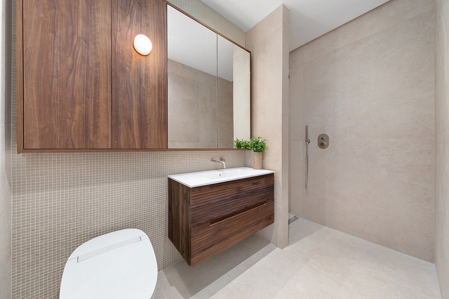 The primary suite features a walk-in closet and a pristine en-suite bathroom with large-format Prissmacer porcelain tiles, a custom Lucena Bath double vanity, a mirrored medicine cabinet, Artos fittings, and a walk-in rainfall shower. The second bedroom has a reach-in closet, and the second bathroom has a deep Duravit soaking tub with shower. Central heating and cooling and an LG washer and dryer tower are also included.