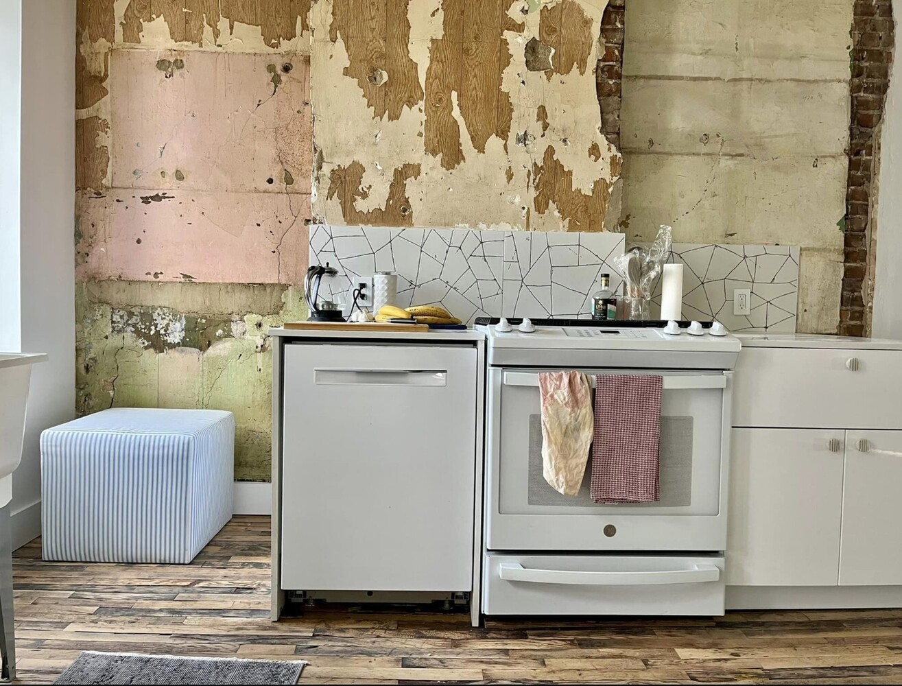 11 foot ceilings, reclaimed hardwood floors, and oversized windows all bring bright and warm character, while the clean white cabinetry and modern fixtures strike a polished contrast. The versatile layout easily converts to 1.5 bedrooms, as previously done, or can be enjoyed in its expansive open-loft style. The thoughtfully appointed bathroom boasts a deep, custom soaking tub, heated floors and a washer & dryer. The stylish dine-in kitchen features patinated plaster walls, a double-wide sink, an integrated Bosch dishwasher and French-door refrigerator.
