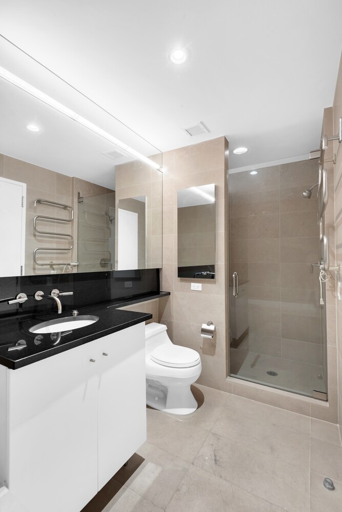 Spanning nearly 1,000 square feet, the apartment impresses with its grand proportions, clean designer finishes, and sweeping city views through floor-to-ceiling windows. The expansive and welcoming living and dining area is ideal for entertaining, bathed in natural light and offering panoramic skyline vistas for you to drink in and relax in sophisticated comfort.