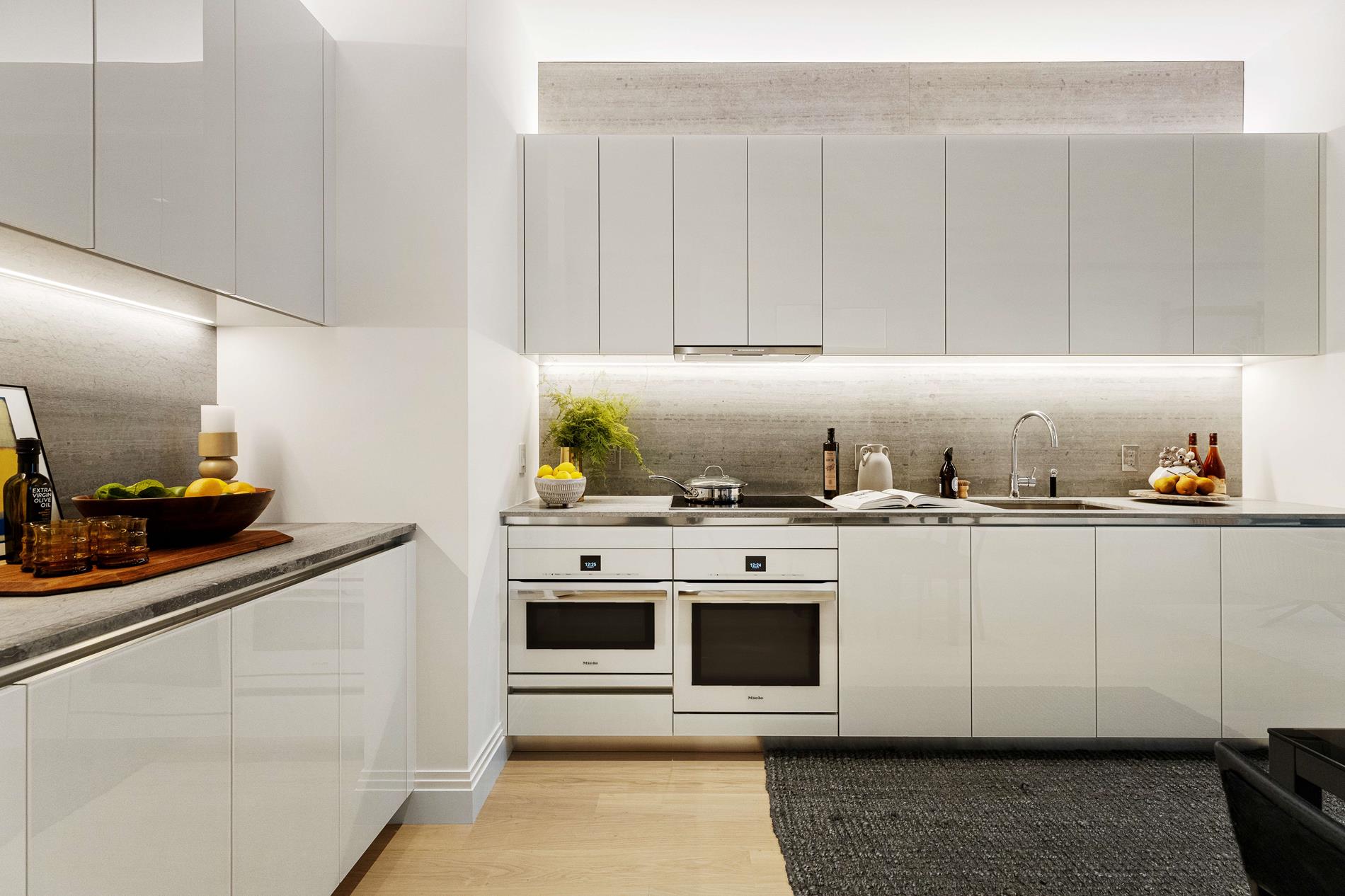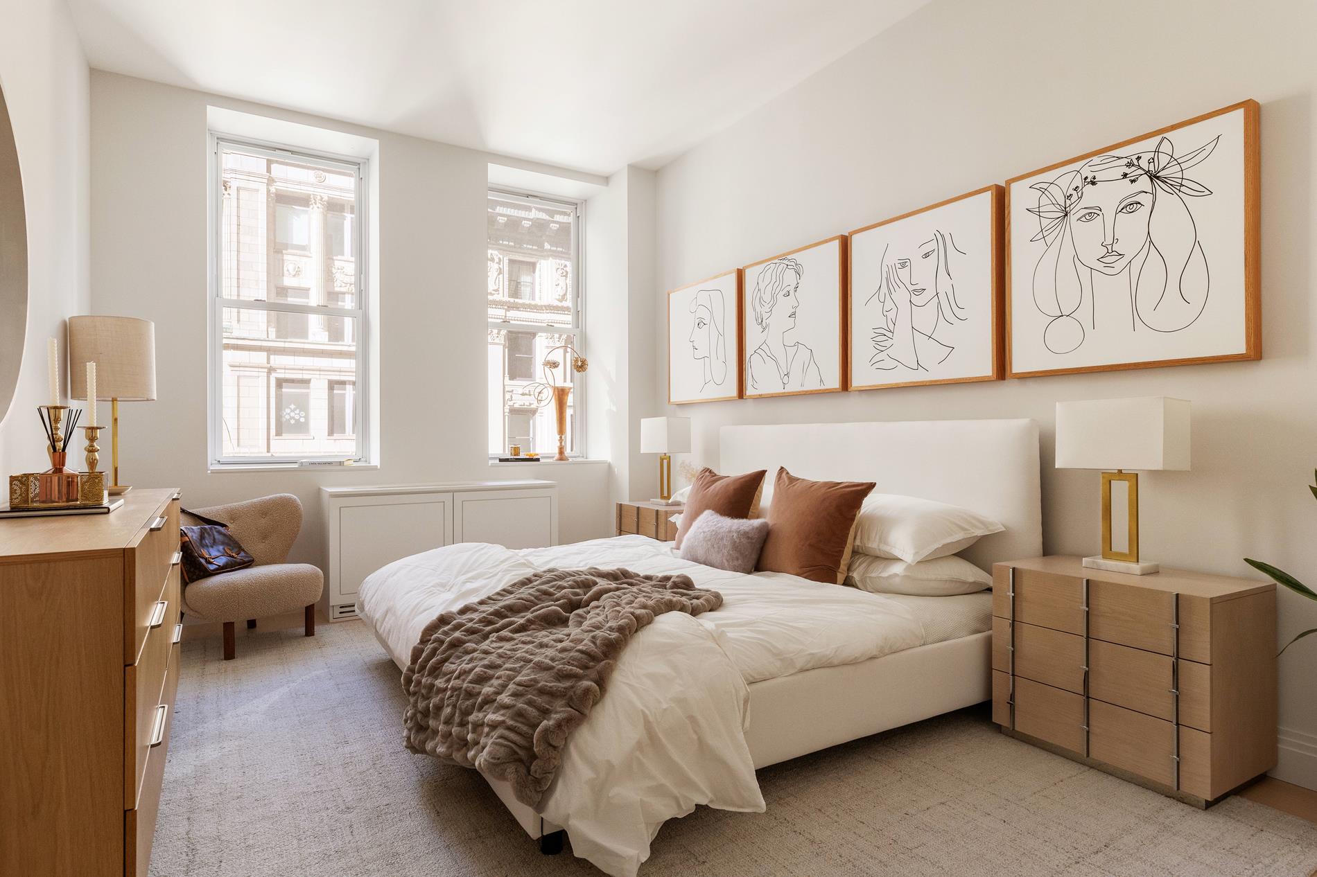 Warm stone primary bathrooms feature stall showers with thermostatic controls. Mirrored medicine cabinets are integrated with LED lighting and Bianco Dolomite marble surround. The building’s one-of-a-kind residences maintain the integrity and character of the 1930s scale, a modern take to art deco detailing, and boast ceiling heights over ten feet throughout with wide-plank French Oak hardwood floors underfoot.