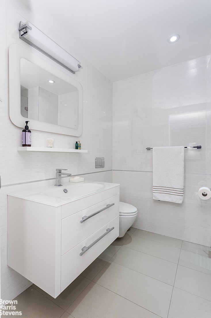 The primary bedroom is a sanctuary of comfort, with ample room for a king-sized bed and a cozy seating area. The bedroom has oversized windows with views of Park Avenue and custom closets with ample storage. The beautifully renovated bathroom with a step in shower is with Porcelanosa tile and fixtured.